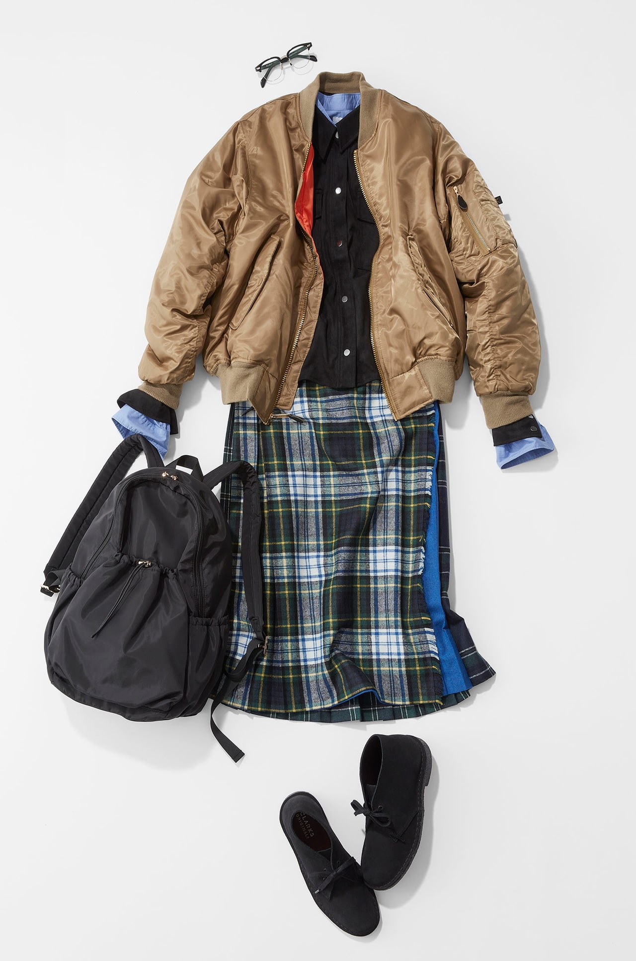 無骨なMA-1ブルゾンにトラッドなチェック柄スカートといった、テイストが異なるアイテム同士の馴染ませ役になってくれるのも、厚着&レイヤードがマストな季節にありがたい。仕上げに黒小物で引き締めると、大人らしいカジュアルMIXが完成します。