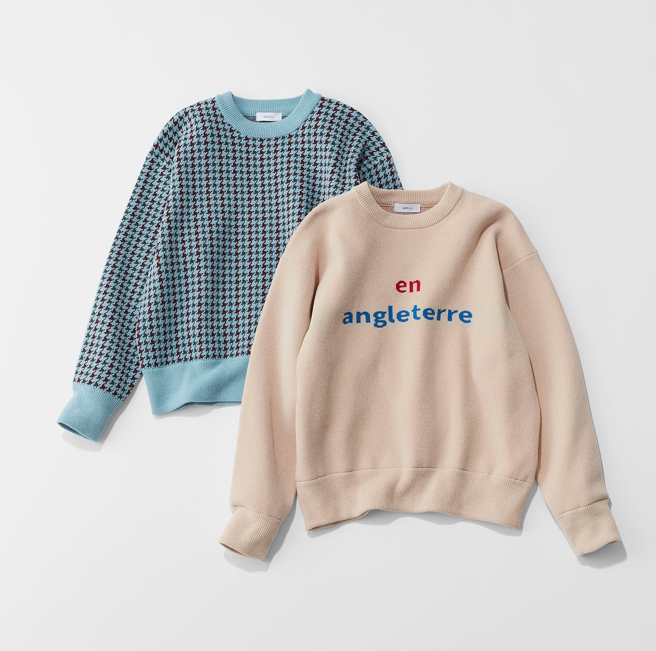 マルチカラーの千鳥格子柄は、玲奈さんが着たカーディガンとプルオーバーの2型。さらに、「en angleterre(フランス語で“イギリスへ”という意味)」のロゴを配したプルオーバーも登場。どちらもクラシカルなベージュと秋冬の差し色にぴったりなサックスブルーの2色展開です。