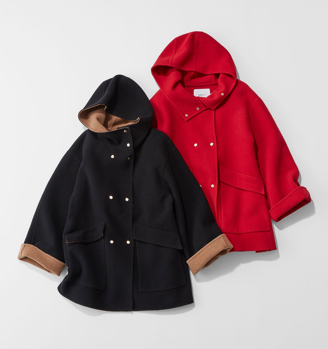 最初に紹介した「ミドル丈リバーコート」と同じ、SHIPS anyオリジナル生地を使用。ゴールドカラーのスナップボタンをダブルで配したフロントデザインや、大きなフラップポケットでトラッドなムードを高めた、可愛げたっぷりのフーディタイプです。