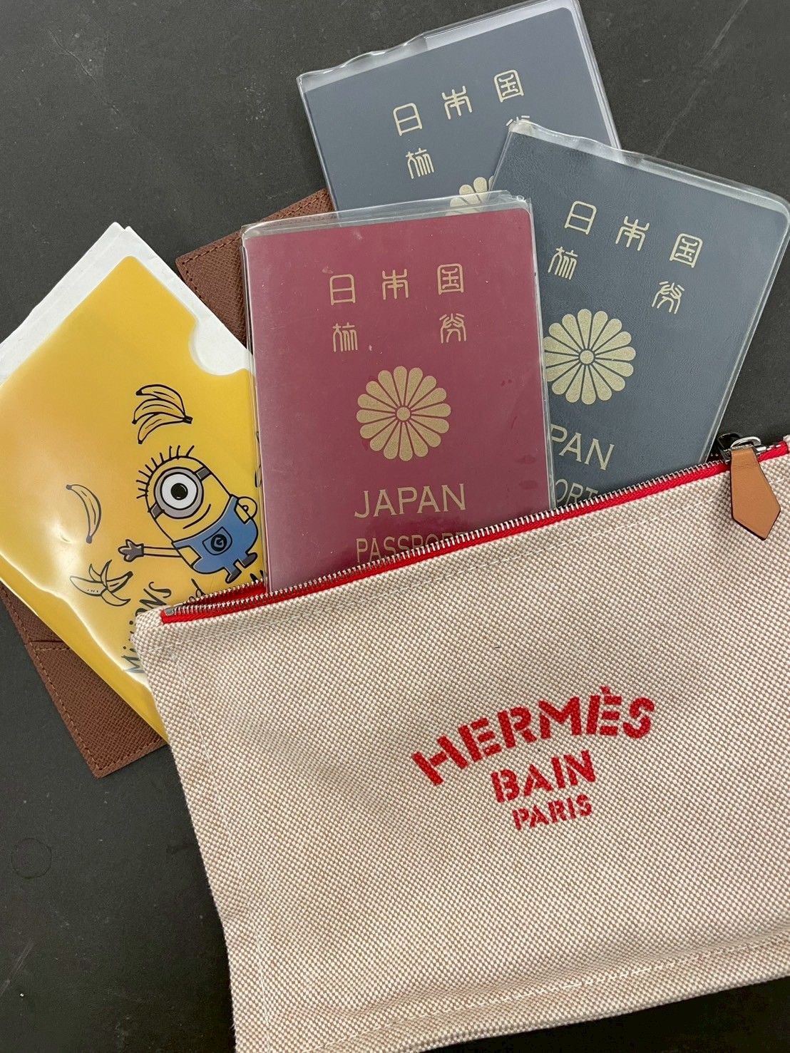 冒頭の写真は、私と子どもふたりの分のパスポート。エルメスのフラットポーチにまとめて入れています。ミニオンズのファイルには、ビザなどの書類を。