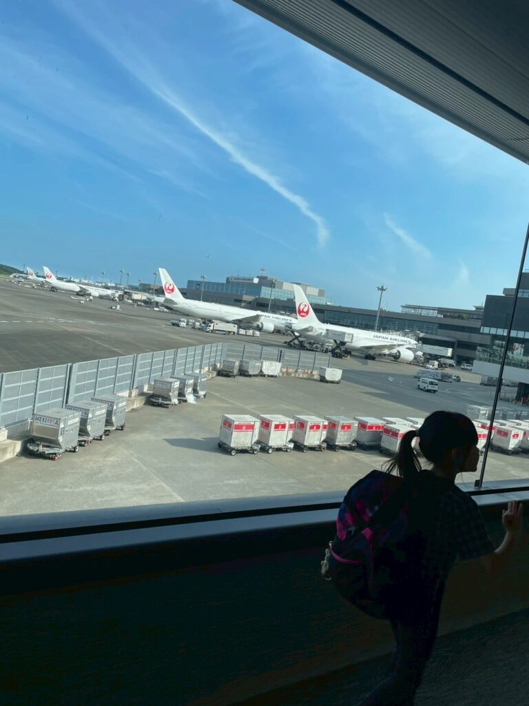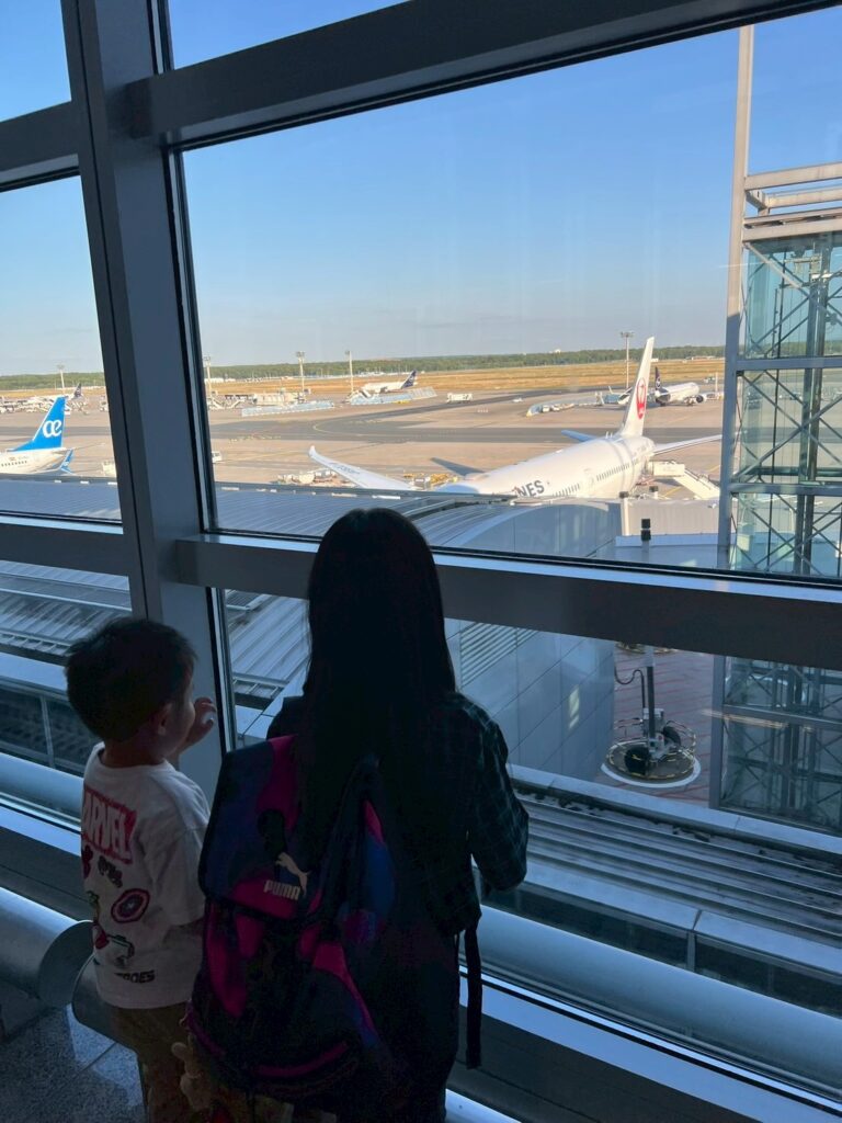 空港で時間を持て余さないように、早く着きすぎないようにしているのですが、それでもチェックインしてから搭乗までは時間があいてしまうので、無事に搭乗するまでが一番大変かもしれません。持ってきたおもちゃやお菓子を搭乗前に使い果たさないように、窓から飛行機を眺めたりしながら、なんとか時間を過ごすのに必死です。空港のラウンジも、大人だけならゆっくりしたいところなのですが、子どもはすぐ飽きてしまうので、30分くらいでサッと食べてお手洗いに行ったら移動する、という感じです。