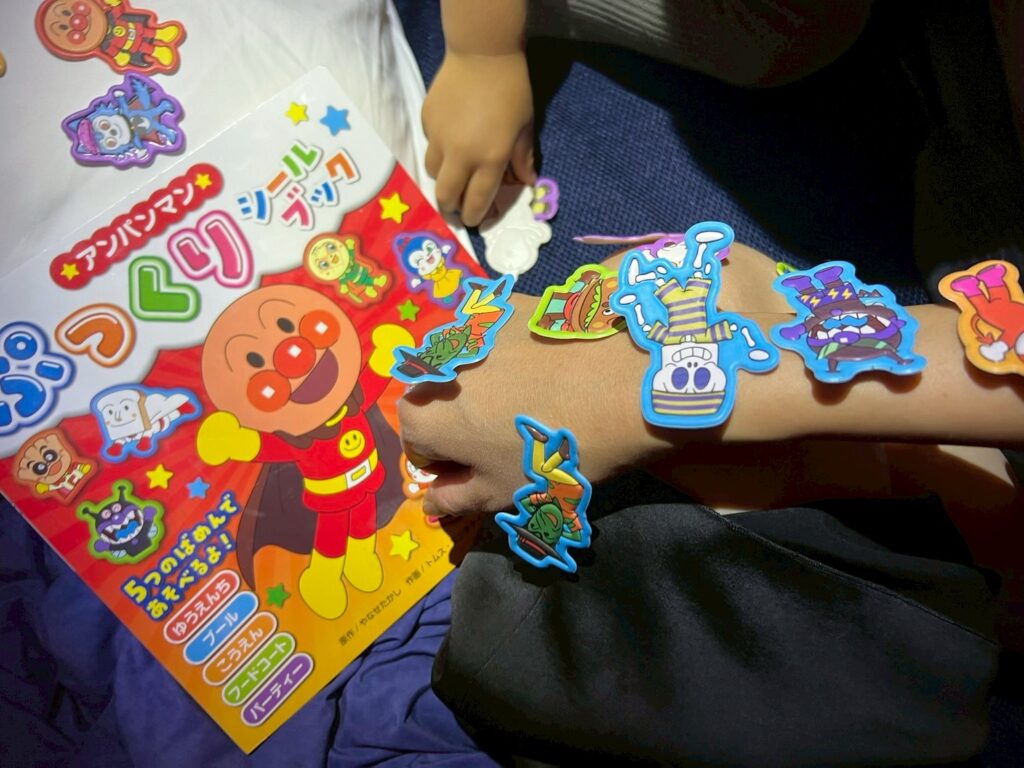 無事飛行機に乗ってしまえば、まずはひと安心。フランクフルトから成田へは夜便なので、機内食のあと、子どもたちは7-8時間は寝てくれるんです。私もどこでも寝れるタイプなので、子どもが寝て落ち着いたら、観たい映画があれば1本観て、あとはけっこうしっかり寝ています。とは言え、13時間のフライト。息子がちょっとぐずりだしたら、大好きなアンパンマンの出番! これは日本で買ったシールブックなのですが、1枚1枚が大きくて厚みがあり、貼ったりはがしたりできて、機内でのシール遊びに最適でした。