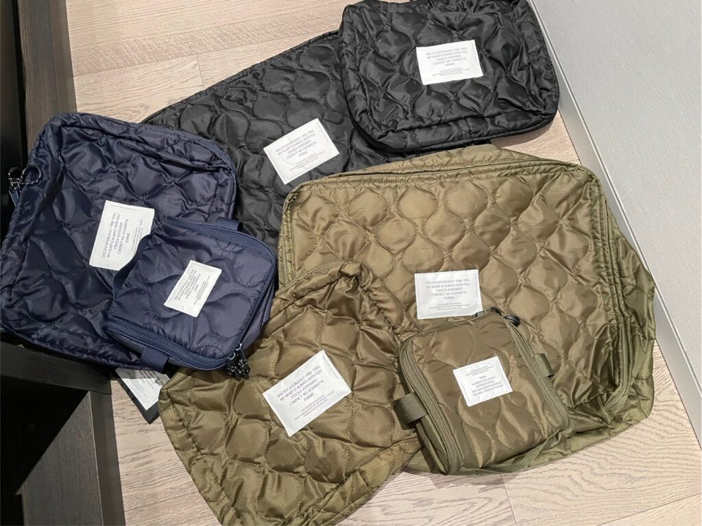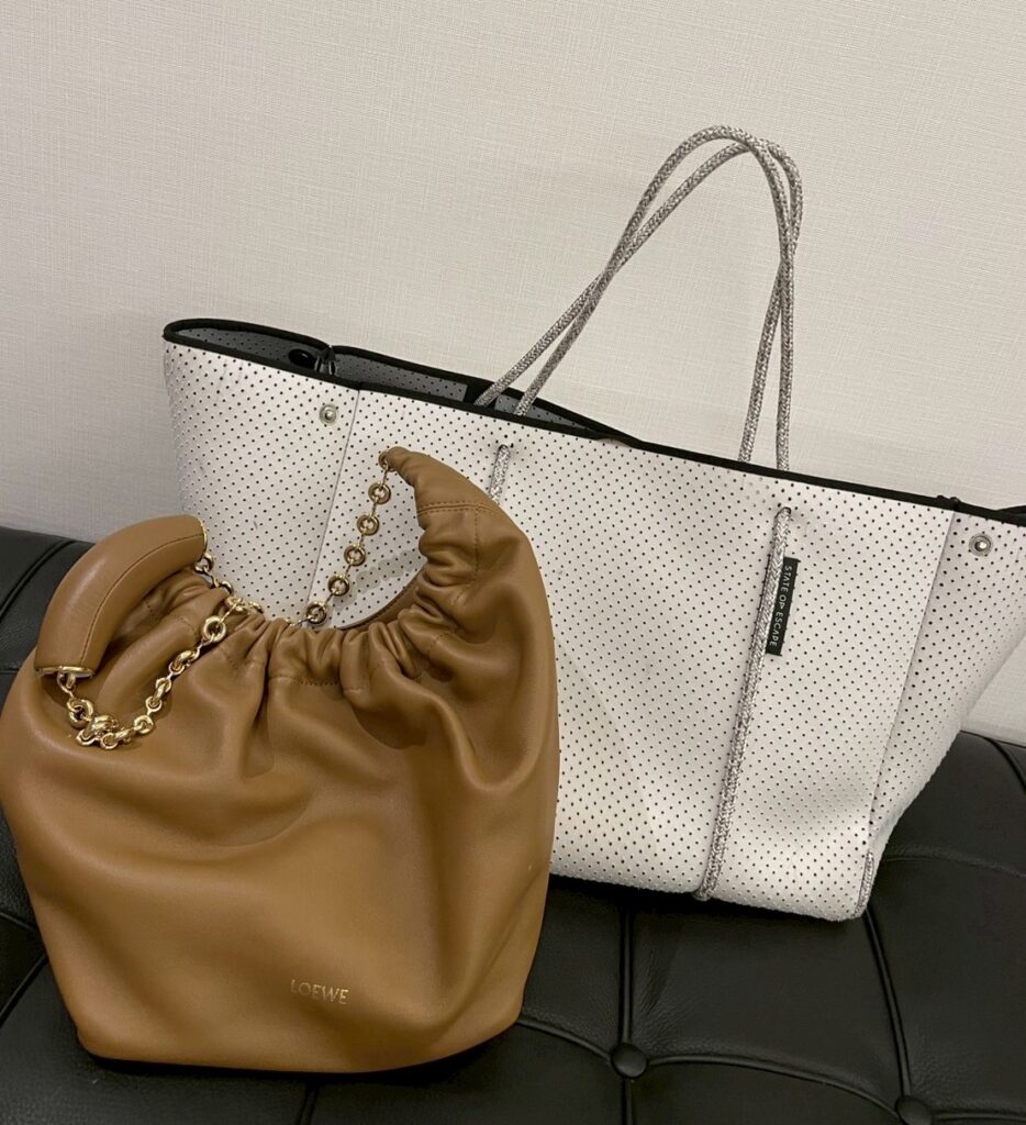 機内持ち込みバッグはこの2つ。手前のロエベのショルダーバッグには、貴重品や私が機内で使うリップクリームやミスト、オイルなどの保湿アイテムと、かっさやポインターなどマッサージグッズ。後ろのステートオブエスケープのトートには、子どもの着替えや上着、オムツなどを入れています。つい「念のためこれも入れておこう」と思ってしまって、「結局使わなかったな~」ということもよくあるのですが、子どものものはどうしても多くなってしまいます。