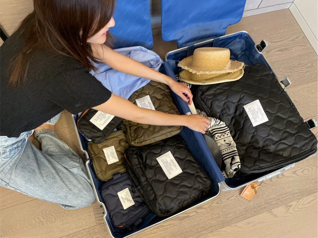 スーツケースの中は、東原亜希さんプロデュースのブランド「FORME」で販売されていたトラベルケースとポーチで整理しています。私・娘・息子で色分けしていて、大きいサイズに洋服、中サイズに下着など、小さいポーチには私はスキンケアやコンタクト、娘はヘアゴムなどを収納。キルティング生地でしっかりしているし、細部まで使いやすく作られていて気に入っています。