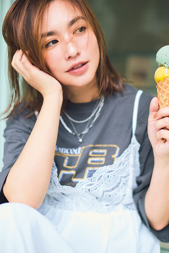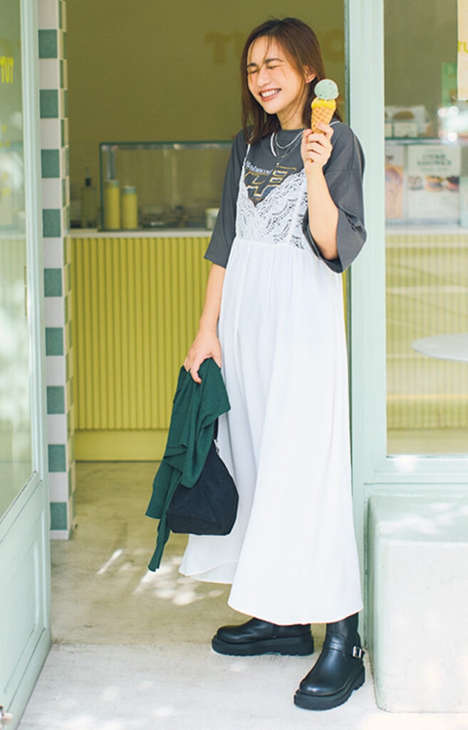 胸元を繊細なレースで切り替えたキャミワンピをお供に、暑さをしのぐために〝アイス休憩〞。残暑の時期はTシャツと、季節が進めば、ロンT、薄手ニット、タートルニットと、さまざまな手持ちトップスとレイヤードできる、文字どおりのお得アイテム。夏の終わりに4桁プライスで手に入れて、シーズンレスで長く楽しむ予定!