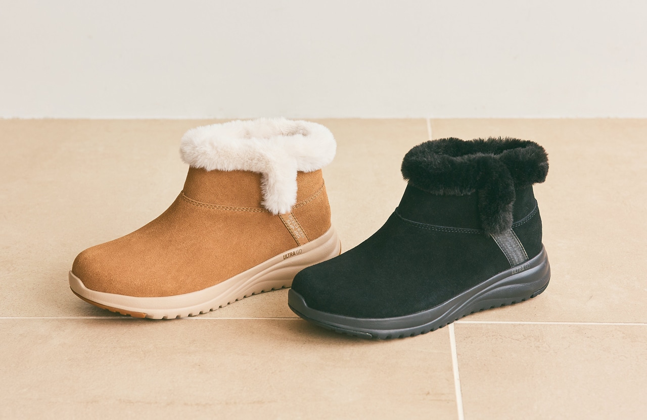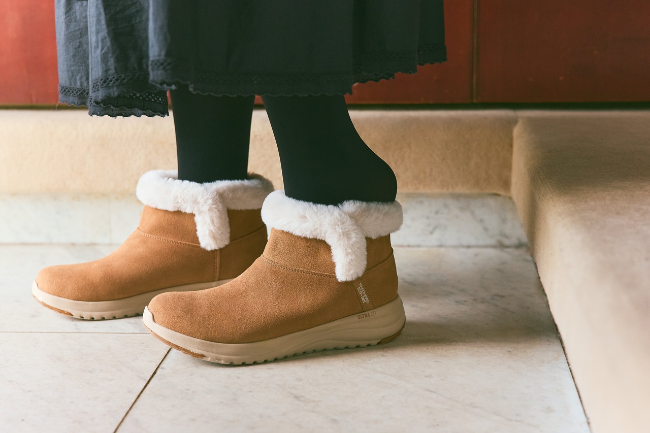 “早く行こうよ~!”とせがまれながら、手には2人分の荷物。両手がふさがってゆっくり座って靴ひもを結ぶ余裕もない朝こそ、手を使わずにサッと履ける「スケッチャーズ スリップインズ」のシューズが大活躍! ふわふわのフェイクファーを贅沢にあしらった[オンザゴー ステラ – ダフネ]のブーツなら、足首までしっかり暖か。真冬の公園遊びやスポーツ観戦など、一日外で楽しむ日にもぴったりです。