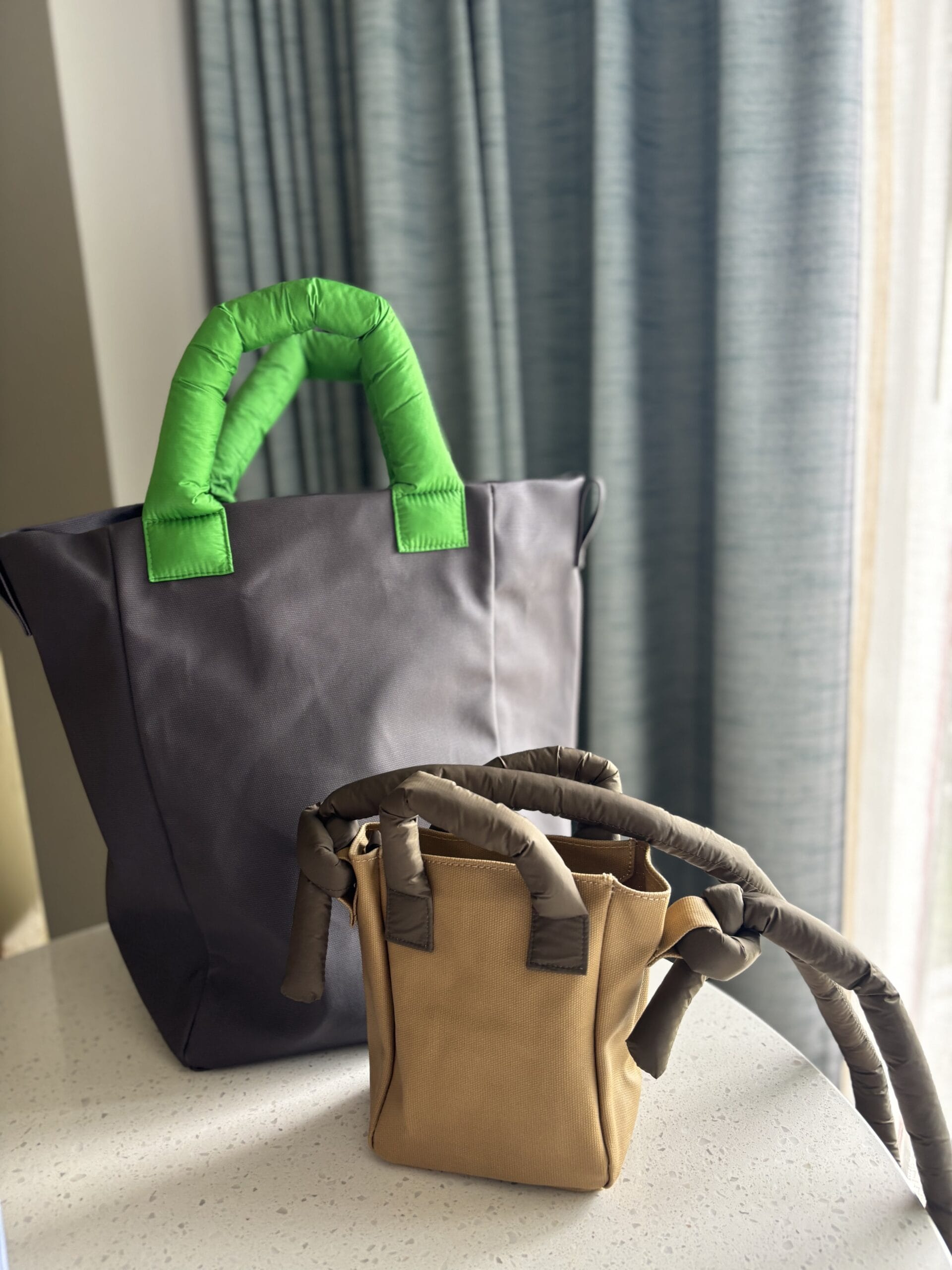 スモールサイズは、財布やスマホが収まるサイズ感で、保育園の送迎や近所のお買い物にも便利。先ほど斜めがけしたように、長いハンドルは結んで長さを調節できるので、両手がふさがりがちなママにも心強い存在です。