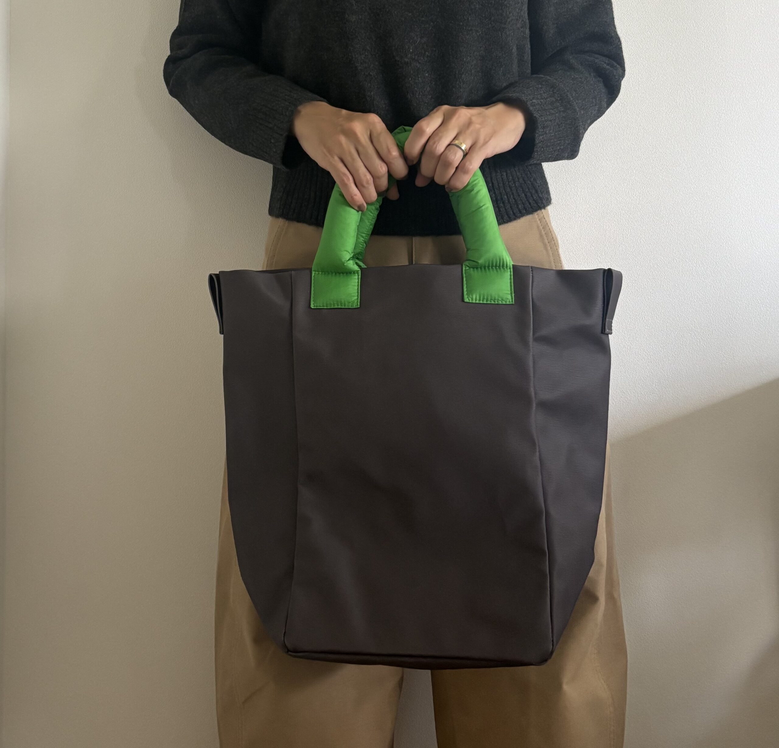 ミディアムサイズは、ペットボトルやA4サイズの資料も縦にすっぽりと収納できるサイズ。マチが広いから、縦長トートでもバッグの中が見渡しやすく、通勤にもおすすめですよ。