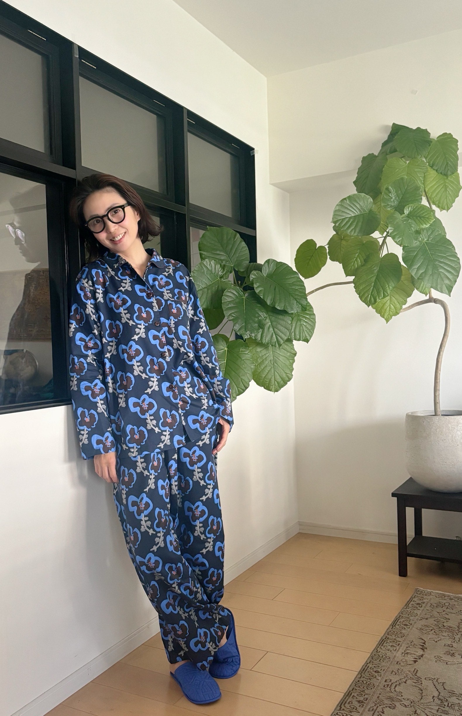 上の写真で、ルームウェアと合わせたスリッパにもご注目。ブルーでリンクさせてみました。小さなことですが、小物の色まで意識することで、なんてことない日常が特別に感じられる。そんな気がします。
