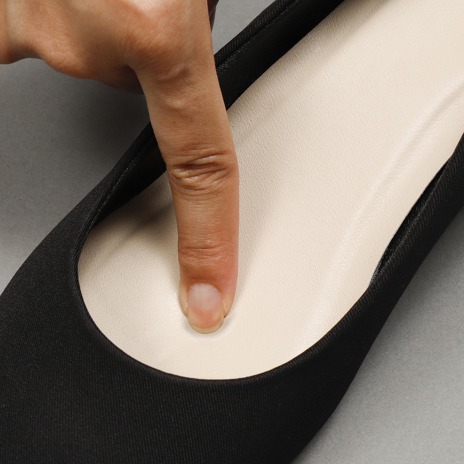 ライニングに使用しているのは、初めて足入れした時から心地よさを実感できる、ふんわり柔らかなスポンジ素材。視覚的に足幅を抑えたすっきりシルエットとは裏腹の、優しく包み込まれるような着用感にきっと驚くはず!