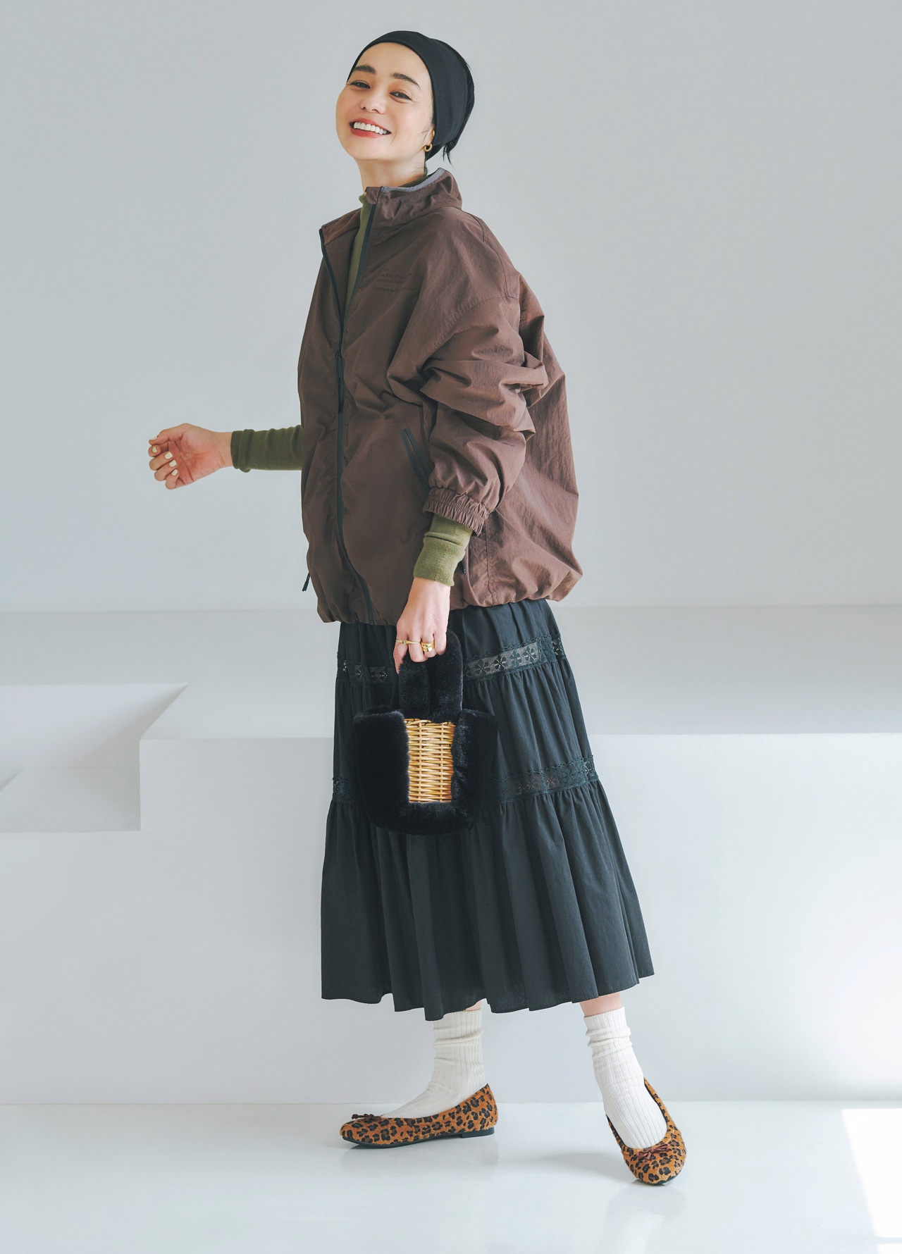 ブルゾン¥33000・ニット¥15400/Life’s 代官山店(トゥデイフル) スカート¥39600/ビリティス(ビリティス・ディセッタン) ヘアバンド¥3850/アーバンリサーチ 渋谷ヒカリエ シンクス店(デコール アーバンリサーチ) ピアス¥26400/プラウ リング(人さし指・中指)¥19800/ズットホリック(ピニャッタ) リング(薬指)¥14300/チビジュエルズ・ジャパン(チビジュエルズ) バッグ¥64900/エバゴス 靴下¥990/タビオ(靴下屋)