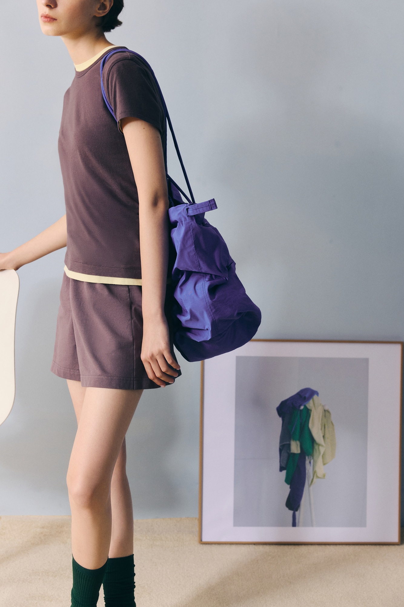 ハンドルや開口部のひもをきゅっと引くだけで、巾着風のフォルムにアレンジできるショルダーバッグ。柔らかく体になじむ軽量ポリエステル素材を採用し、シャカっとしたスポーティさもスタイリングのアクセントに。写真のブルーのほか、グレイやダークブラウンの3色展開です。 気分やスタイリングに合わせてギャザーを寄せて表情を変えられるのはもちろん、中身に合わせてバッグ自体のサイズを調整できる点も重宝。