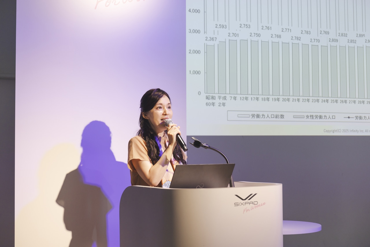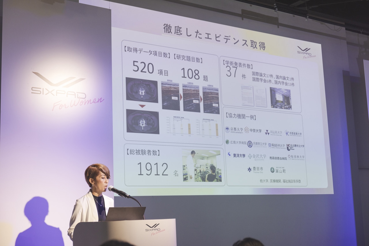 まず登壇したのは、SIXPAD本部 本部長の石谷桂子さん。そもそもSIXPADは、EMSの効果・効能、安全性について、徹底したエビデンスの取得をしてきたブランド 。それらが認められ、今では病院の臨床現場やリハビリでも多く使われているのだそう。こうした実績を持つSIXPADが次に目指すのが、テクノロジーで女性の悩みに寄り添うこと 。効果と安全性にこだわってきたSIXPADだからこそできるフェムテックが、「SIXPAD for Women」という形でスタートしたのです。