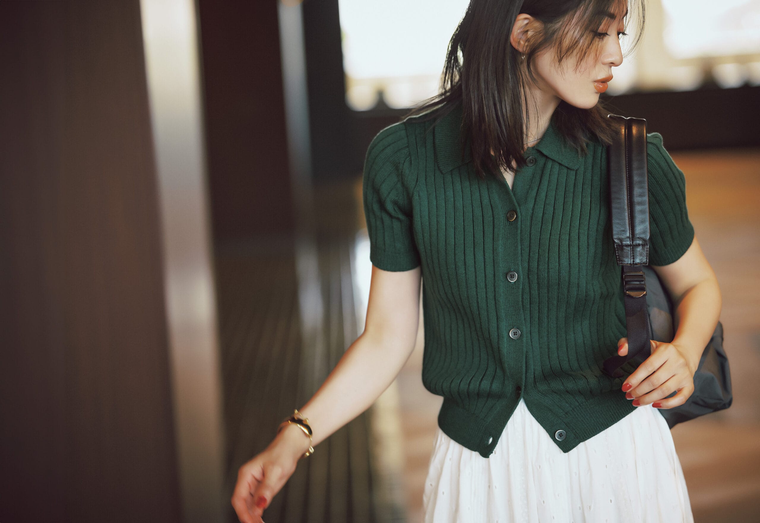 トップを飾るのが『ユニクロ5大最旬服』。「まず注目してほしいのがブルーの短丈シャツ。オックスフォード素材で上質感があり、パンツやスカート、ボトムを選ばないのが魅力。今着ているTシャツをこのシャツに変えるだけで残暑もしのげて秋にもつなげられる。冬はニットを重ねても!」。ほかにもリブニットのポロカーディガンやチェックのジャケットの魅力も語ってくれました。