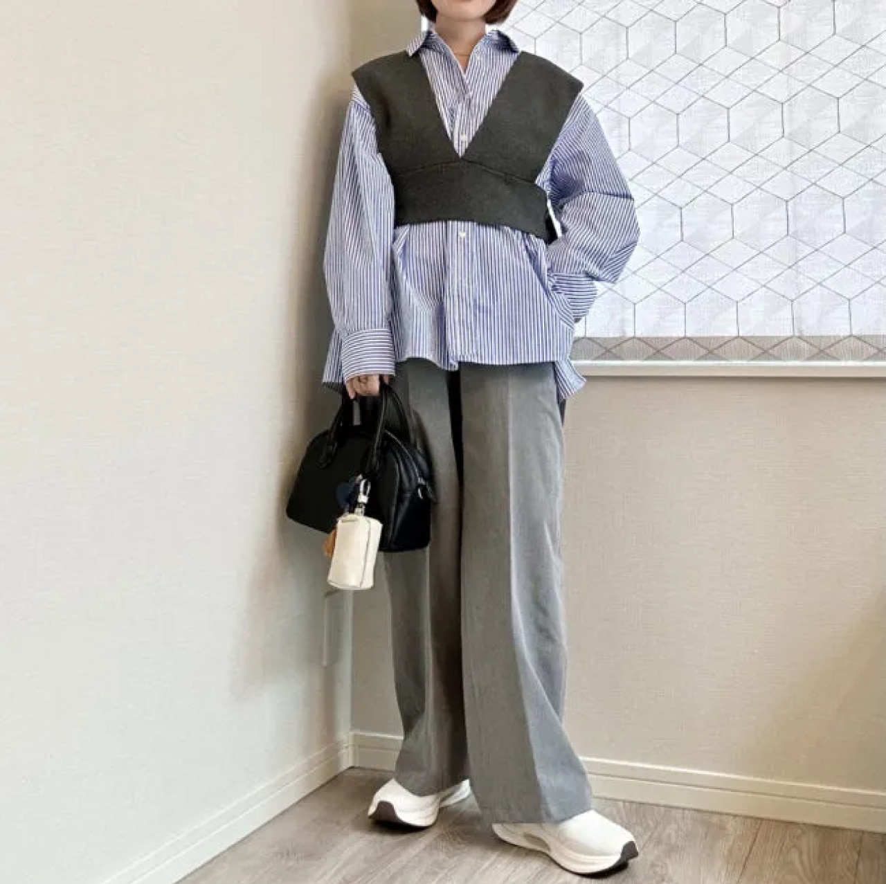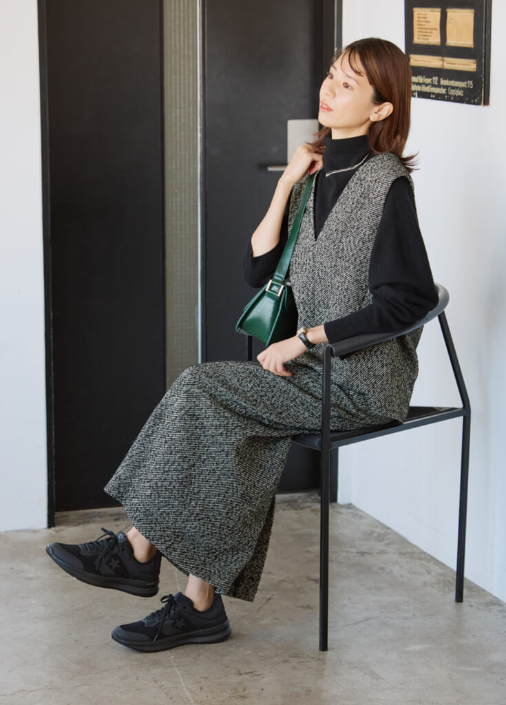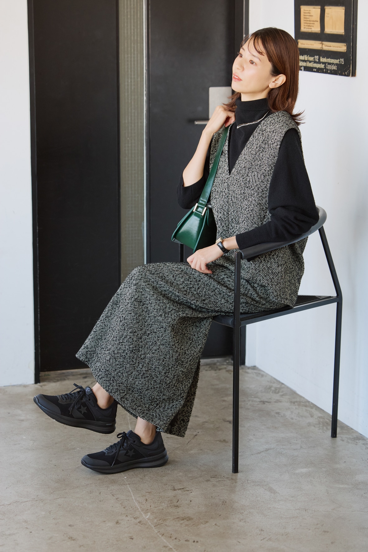 靴 DAYSTAR SLIT SLIDE(ブラックモノクローム)¥8250/コンバースインフォメーションセンター(コンバース) ベスト¥17600・スカート¥18700/アバハウスインターナショナル オンラインストア(ルージュ・ヴィフ) タートルネックニット(12月発売予定)¥8990/アンフィーロ パールネックレス¥40700・ゴールドネックレス¥113300/マリハ 時計¥28600/ピークス(ロゼモン) バッグ¥5995/ロペピクニック パサージュ