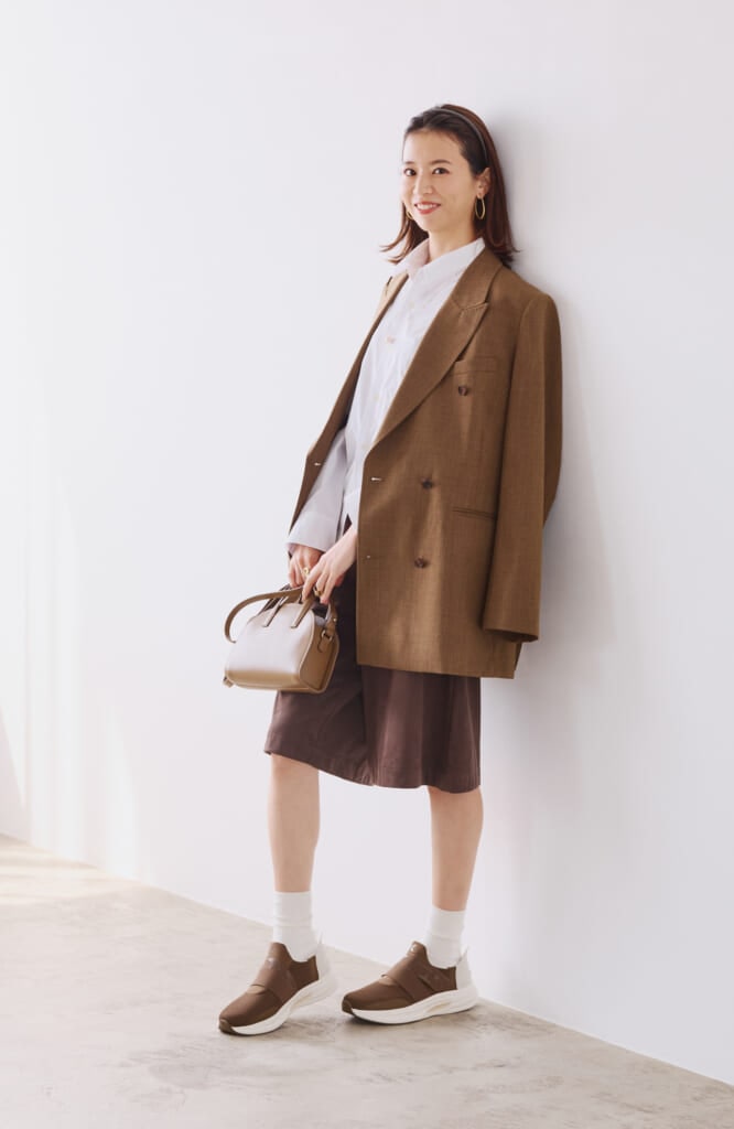 深みのあるビターなブラウンのシューズが足元を引き締め、トレンド感満点のコーディネートに。同色のジャケット&ハーフパンツのワントーンスタイルでハンサムにまとめることで、大人の洒落感が際立ちます。束の間の友人とのお茶やトレンド感を楽しみたい日のコーデにもぴったり。