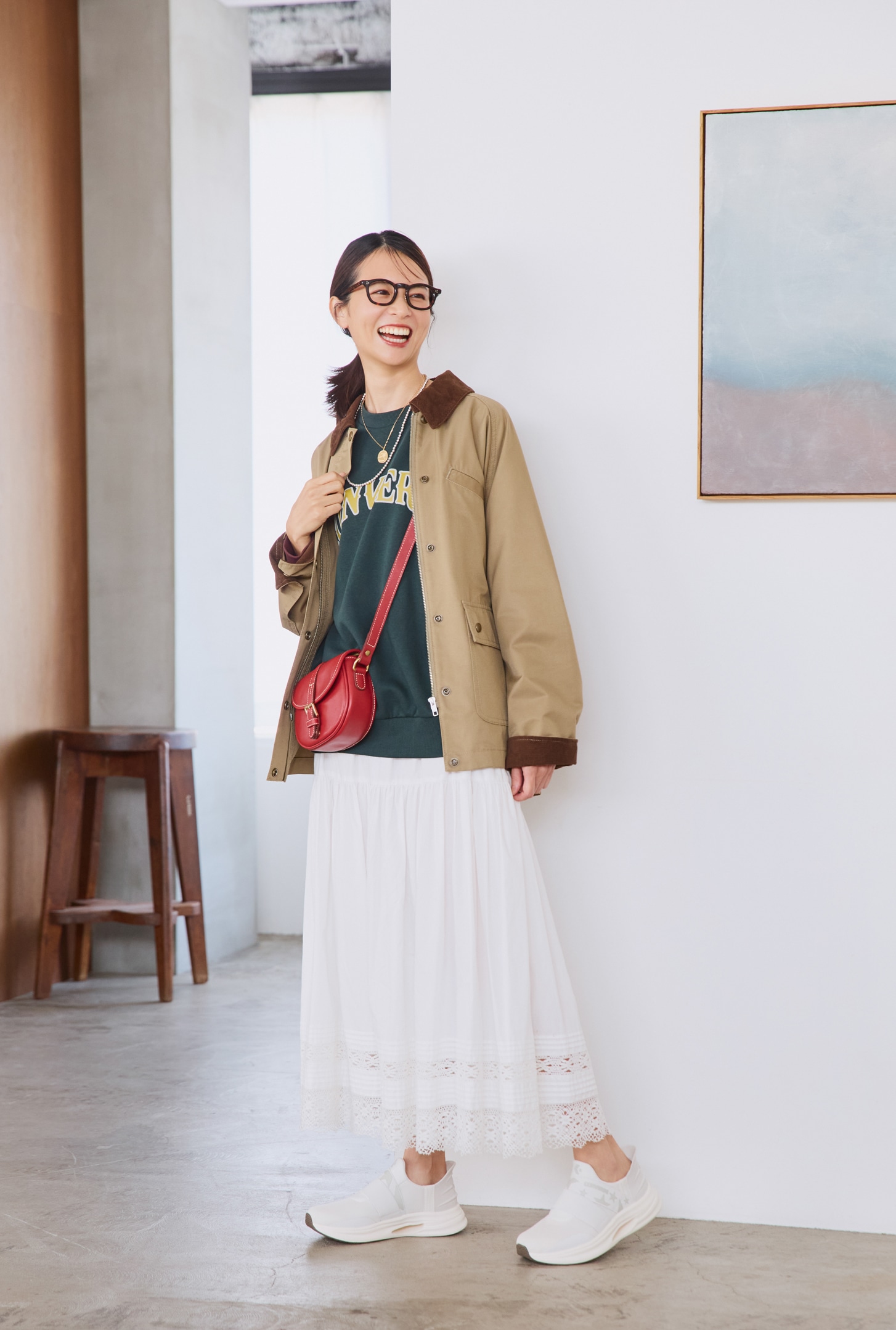 靴「CAVESTAR SLIT SLIDE XG (グレージュ)」¥9790・スウェット¥7590/コンバースインフォメーションセンター(コンバース) ジャケット¥19800/シップス インフォメーションセンター(シップス) スカート¥39600/ビリティス(ビリティス・ディセッタン) メガネ¥46200/アイヴァン 東京ギャラリー(アイヴァン) ネックレス(短)¥27500/マリハ ネックレス(長)¥33000/ズットホリック(アルポ) バッグ¥62700/グリニッジ ショールーム(タスティング)
