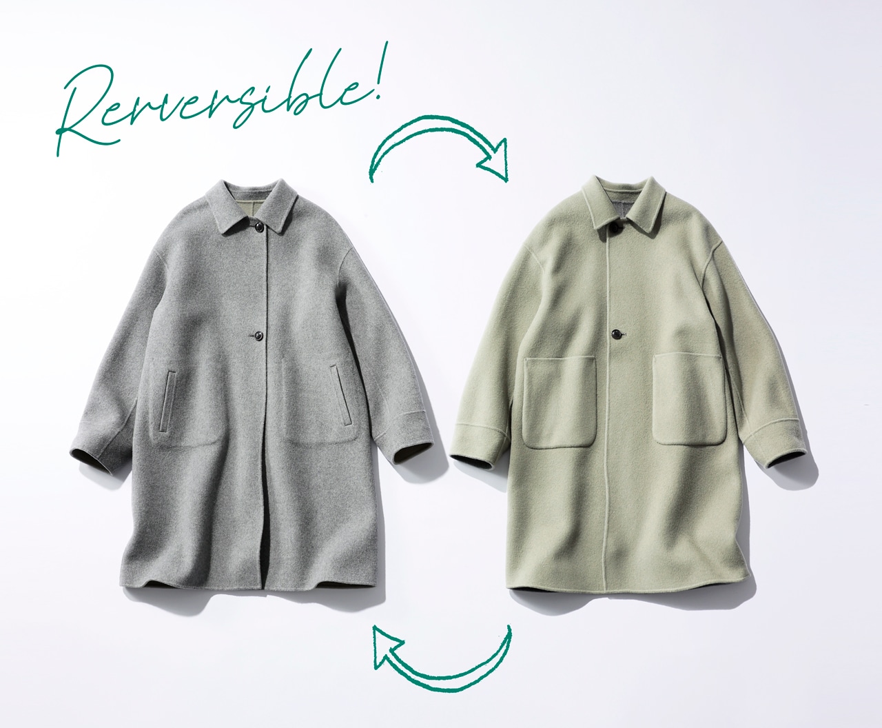 ヒューマンウーマンで定番人気を誇る、リバーシブルのウールコート。今季の注目は、オールマイティなトップグレーと、着こなしのアクセントになるセージとを組み合わせた、ステンカラーコート。高級感のある素材と上品な発色で、いつものカジュアルスタイルに一枚まとうだけで、特別感のある印象に仕上がります。きれいめなワンピースやスーツスタイルとも好相性で、ちょっとしたオケージョンやお出かけにもぴったり。気分やシーンに合わせて、さまざまな着こなしを楽しんで!