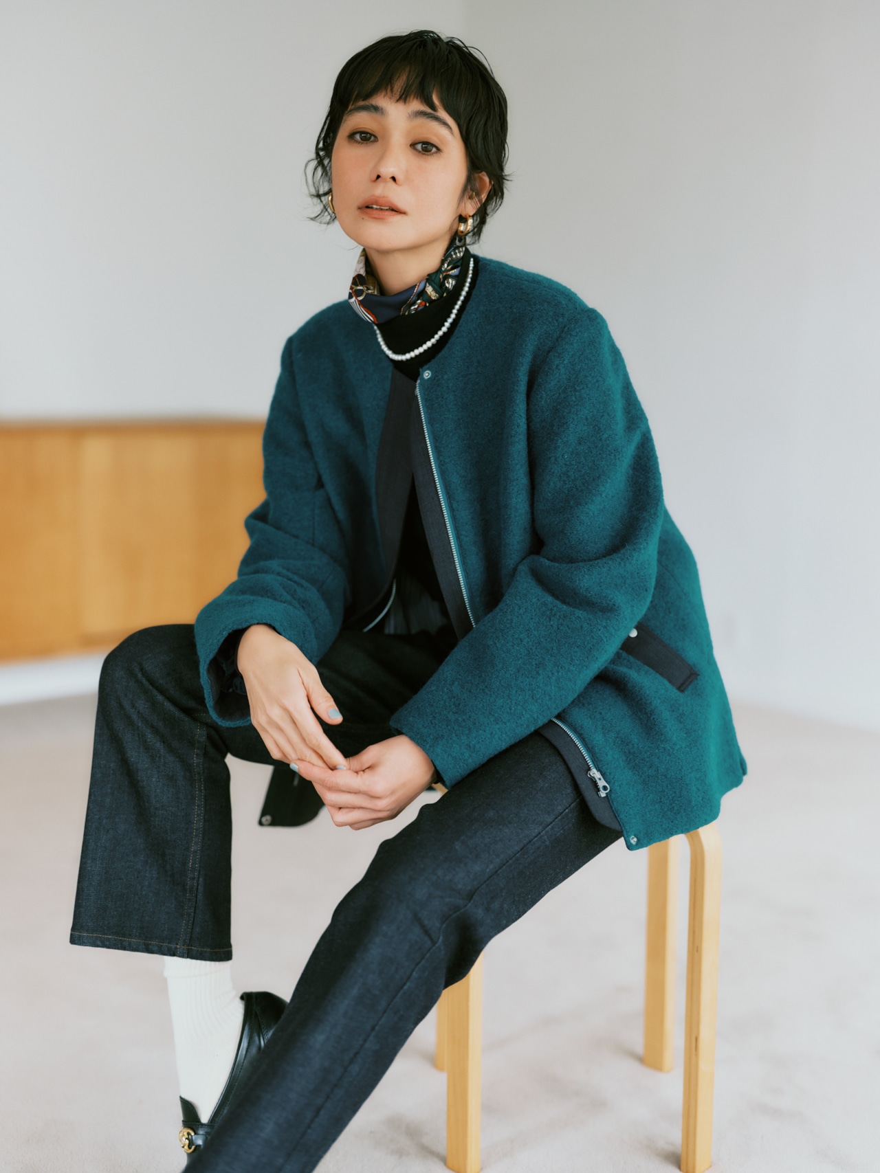 糸から織るのではなく、繊維をそのまま編み込むという特殊な製法で作られたスライバー素材を採用。ボリューム感がありつつも驚くほどの軽さを叶えた、スペシャルな一着が誕生しました。ヴィンテージ感のあるピーコックグリーンは、ノーブルでいて今どき感たっぷり。前端とポケット部分はブラックテープで切り替え、モダンかつシャープな印象を演出しています。いつもの着こなしを新鮮に彩る一枚を、今季のワードローブに仲間入りさせて!