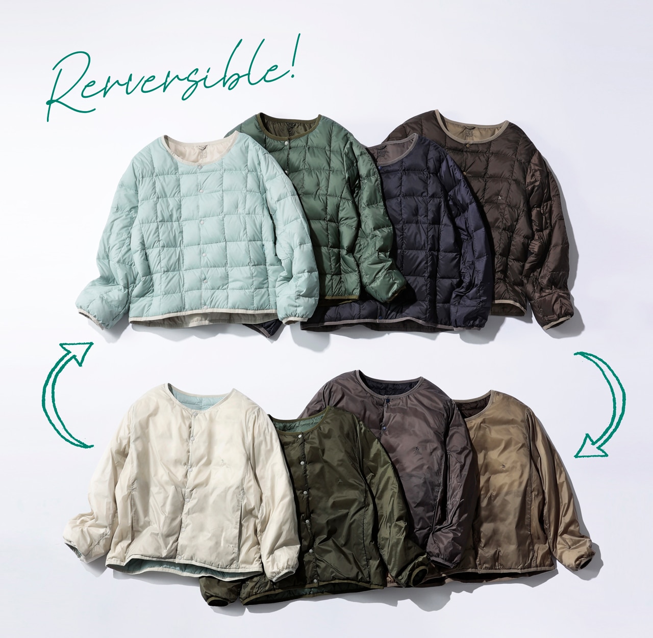 アウターとしてはもちろんのことインナーダウンとしても大活躍するダウンジャケットが、リバーシブル仕様にアップデートされて再登場! 2色の異なるカラーが楽しめるのと同時に、表面はカジュアルなキルトデザイン、裏面はスタイリッシュなノンキルトデザインと、異なる雰囲気を楽しめる贅沢な一着です。左胸に施された「h」の刺繍もとびきりキュート。パッカブル仕様なので持ち運びも便利です。