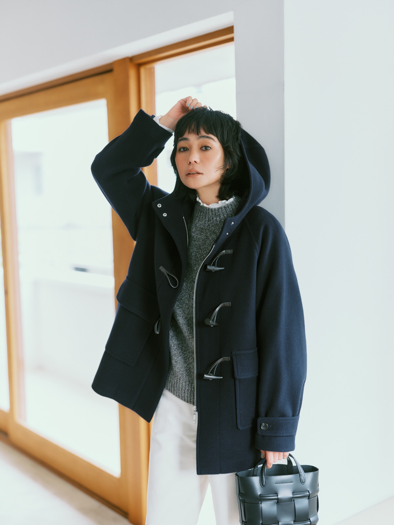 軽い着心地と暖かさを保証するウールナイロン素材を採用することで、従来のダッフルコートにありがちだった“重さ”や“堅苦しさ”を払拭。ダッフルならではのトラディショナルな魅力と現代的な実用性とを両立する一着は、ベーシック派にとっての最強の存在になること間違いなし。白パンツと一緒に着れば、永遠に大好きな冬のマリンスタイルが完成します。合わせるボトムを選ばず足さばきも良好な、万能のミディ丈も必見です。