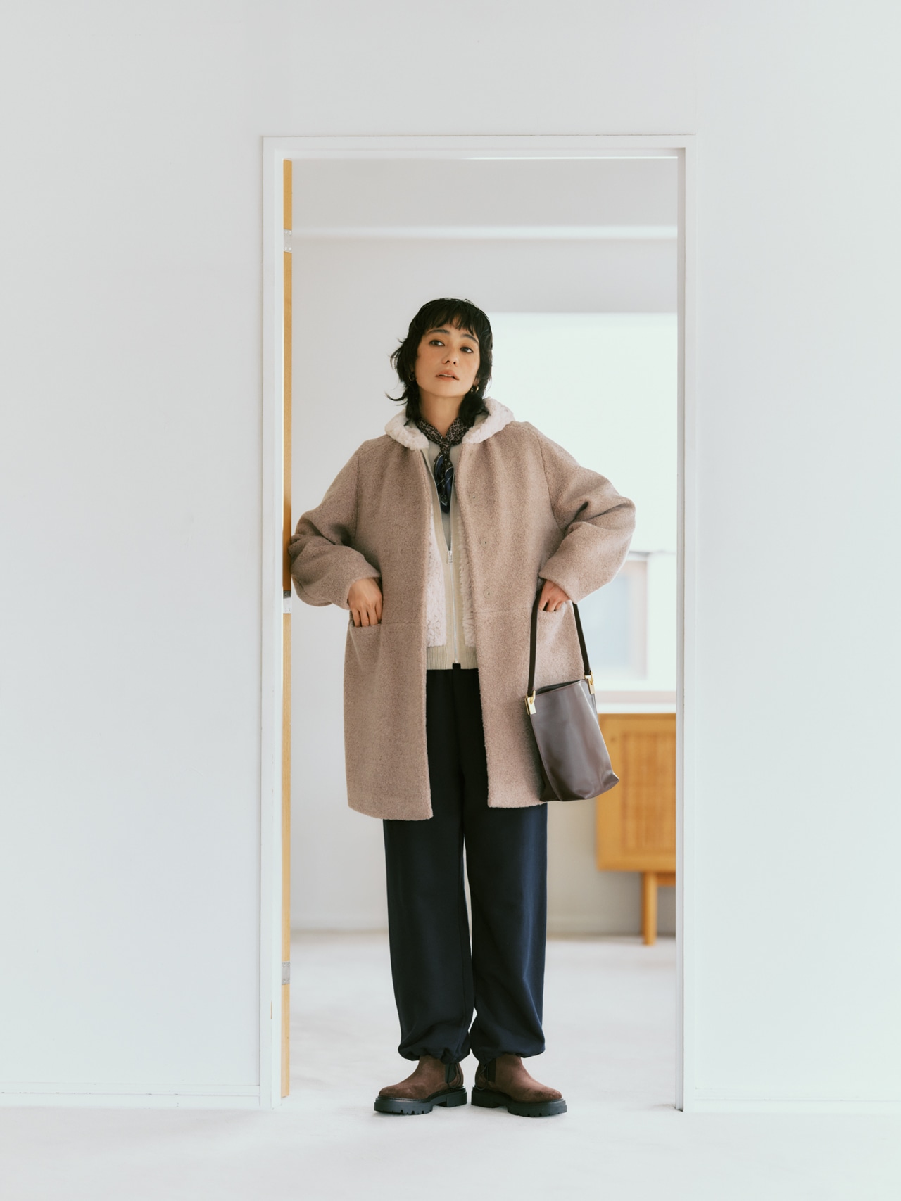 ボア素材のノーカラーコートがあれば、カジュアルもフェミニンも思いのまま!