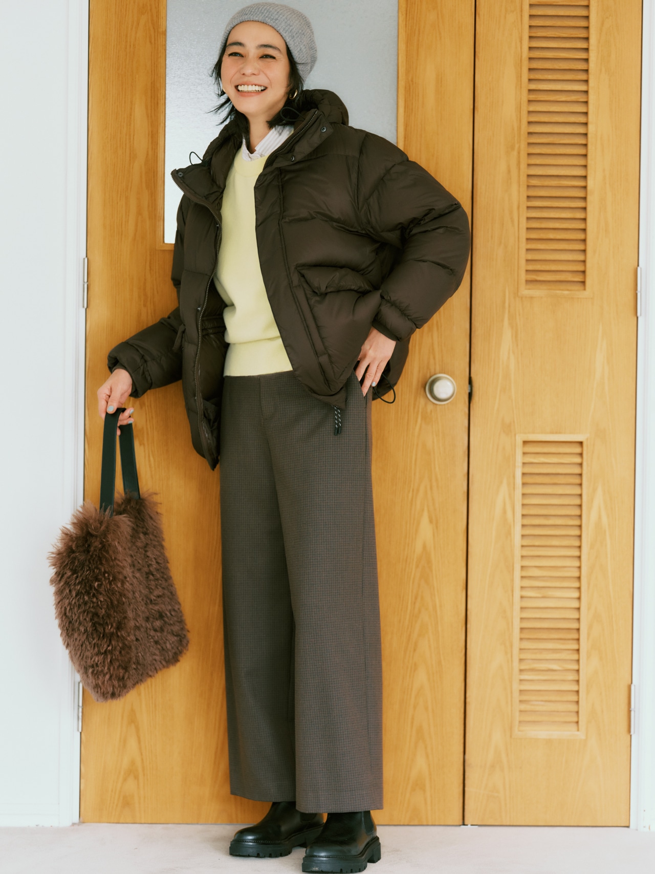 ダウンコート(巾着袋つき)¥41800・ニット¥17600・シャツ¥19800・パンツ¥18700・帽子¥9900・バッグ¥18700(以上ヒューマン ウーマン)・靴¥24200(エネス)/ヒューマン ウーマン ピアス/スタイリスト私物