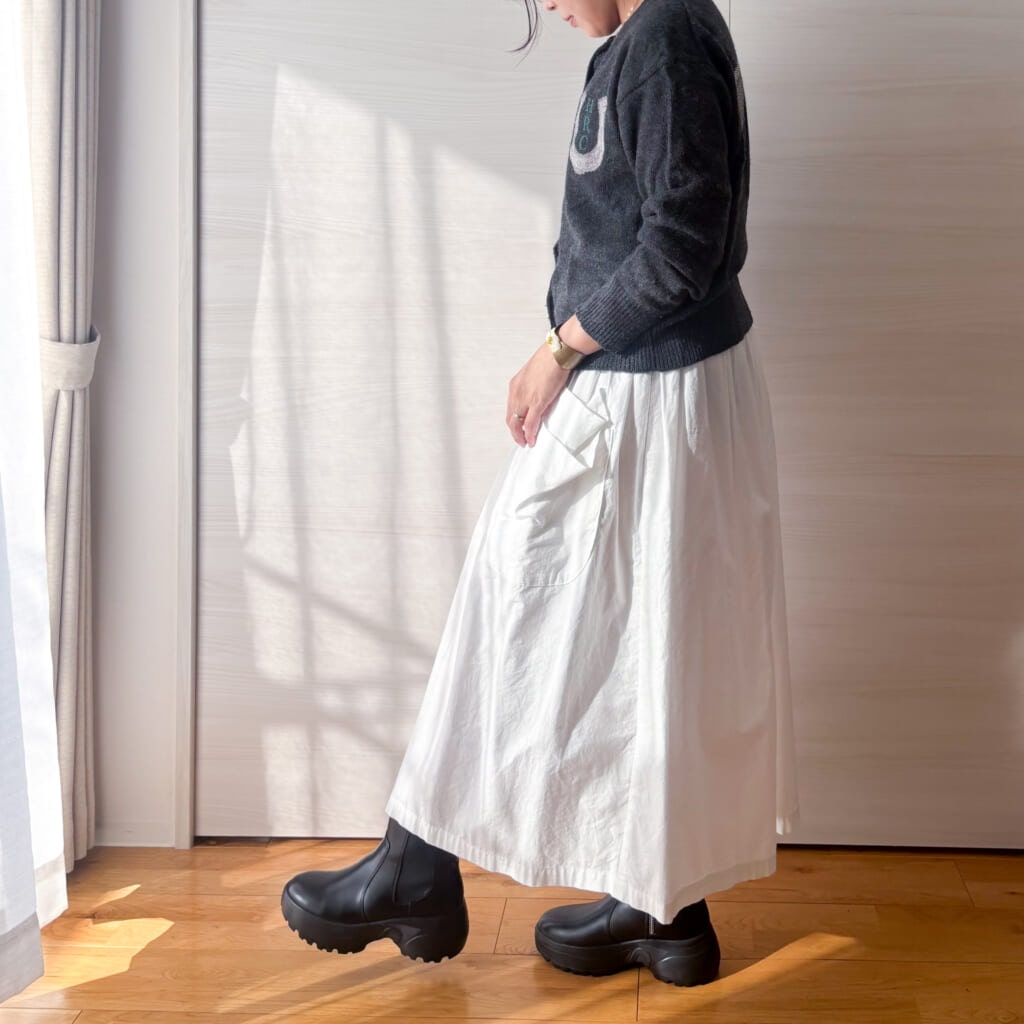 2型ともスタイリッシュで、着脱時も外出中もノンストレスで履ける自信作。中でもホワイトのサイドゴアブーツは、クリーンなのに浮いて見えずコーデになじむ色合い。想像以上に使えます!