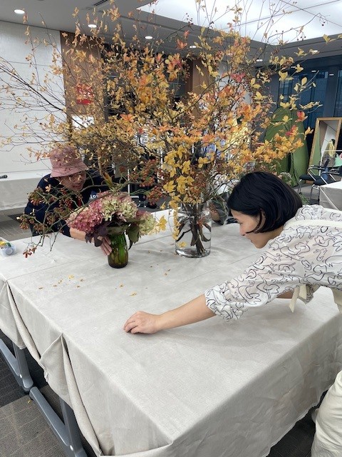 パーティの前日にお花の搬入がありました。今年もアレンジは「ウヴル」の田口一征さんと岩永有理さん。「秋が短くなった分、パーティでは思いっきり季節感を味わってほしい」という思いから「秋のテーブル」をテーマに装花を考えてくれました。中央のテーブルに背の高い「ドウダンツツジ」の枝。ドウダンツツジは初夏の頃のグリーンの葉のイメージが強かったので、赤く色づいた葉に感激。その側にはたっぷりと生けられた「秋色あじさい」。パーティ会場にシンボリックに映えて、まさに屋内ながら自然の中にいるような“秋を知らせてくれる”アレンジでした。