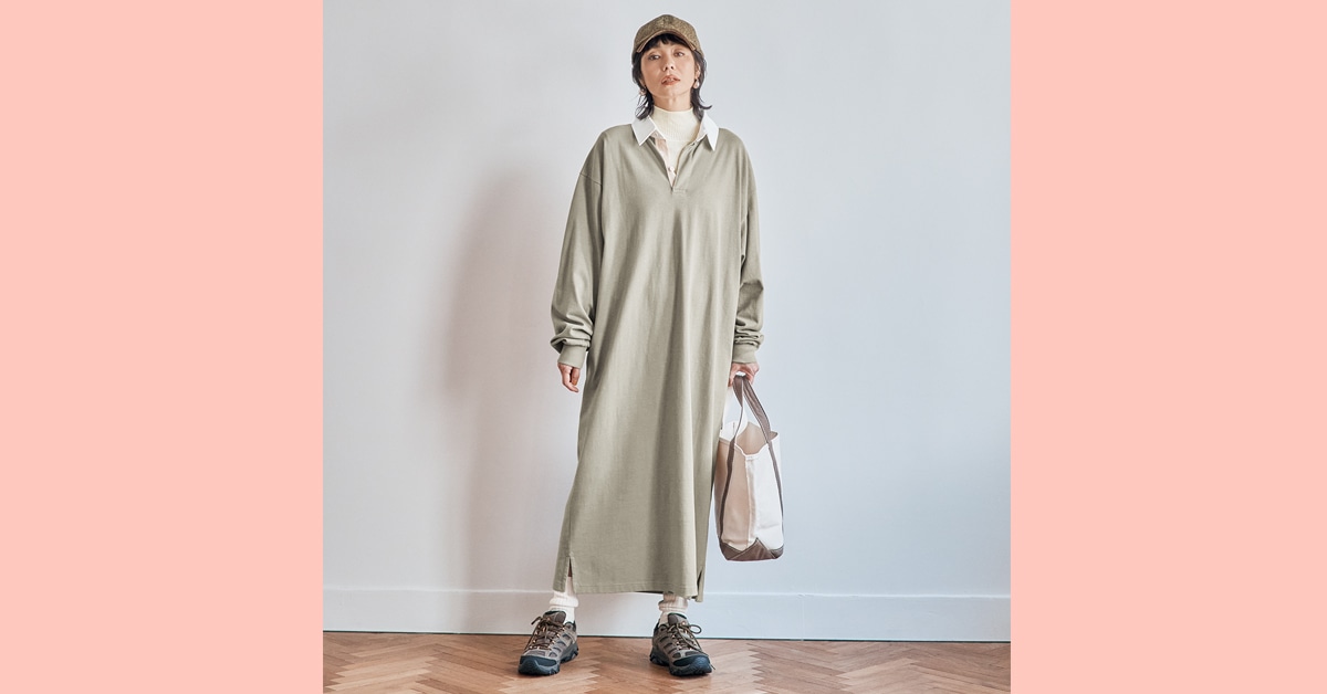 まろやかなベージュのラガーシャツワンピースで、大人のやさしげカジュアル/明日なに着る?