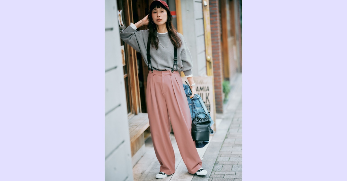 【愛用スラックス】身長156㎝LEEマルシェ副店長N恵はピンクの【12closetの「サスペンダーパンツ」】がお気に入り!