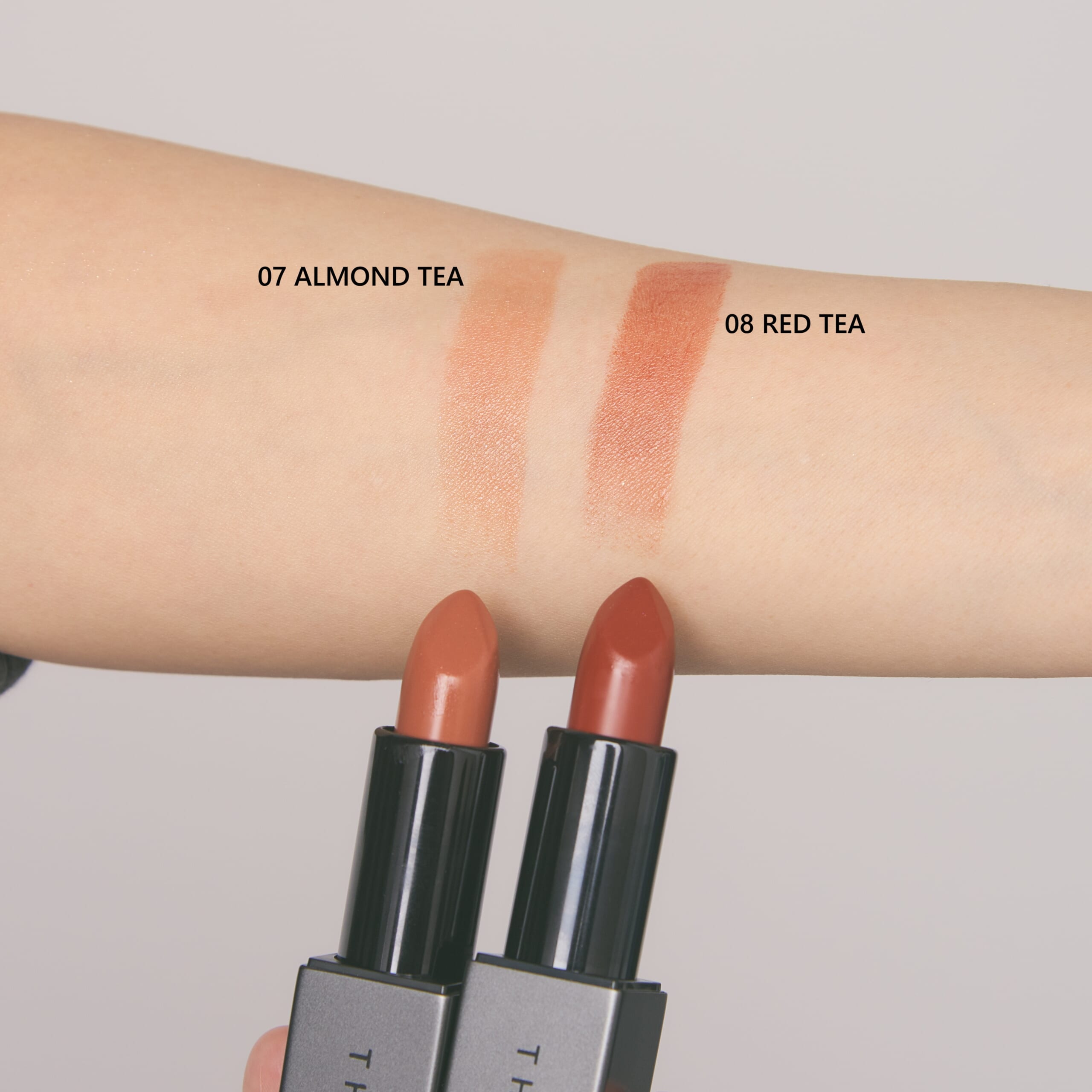 シアーな発色と軽やかながらコクのある塗り心地が魅力のTHREEのシグネチャーリップ。左が【07 ALMOND TEA】、右が【08 RED TEA】。