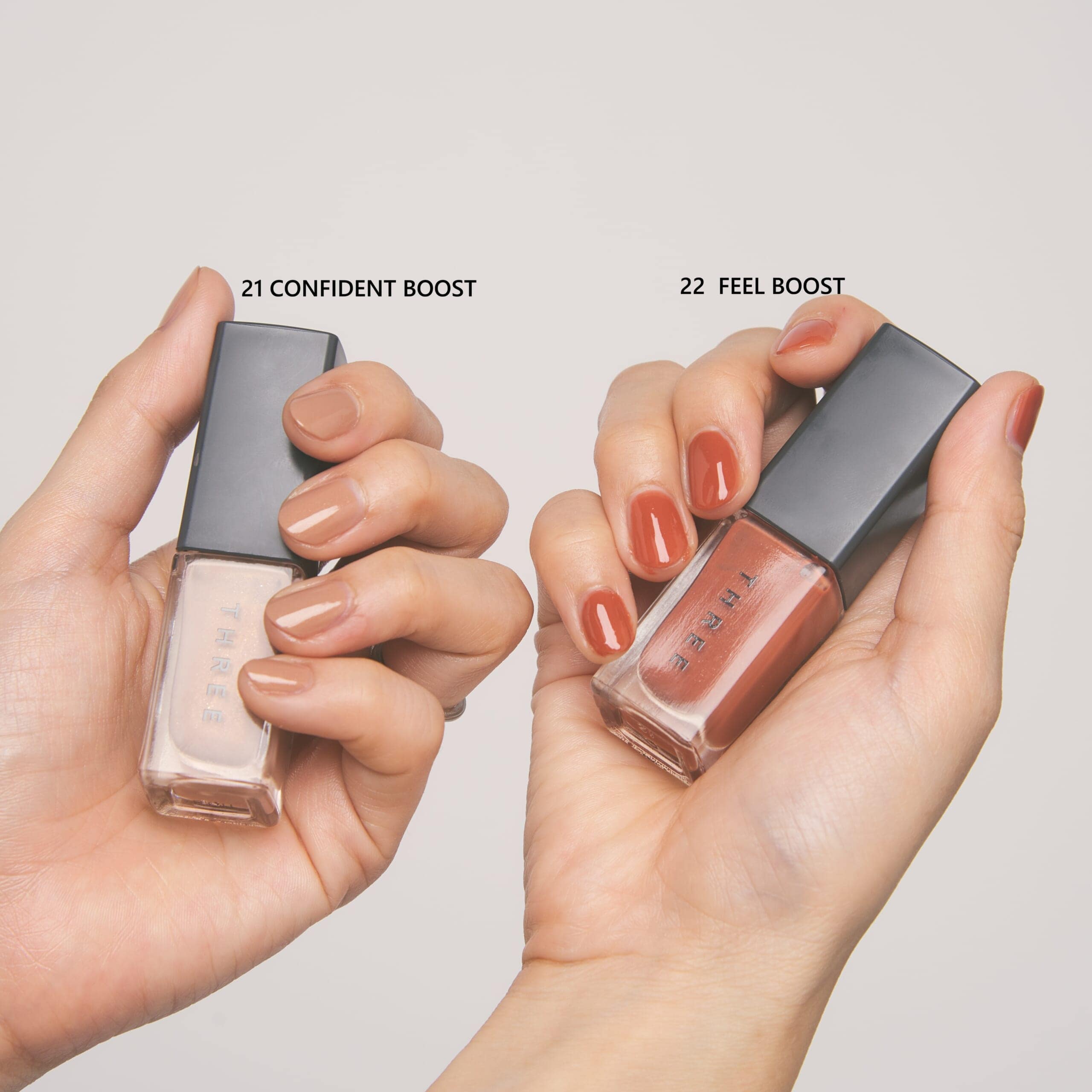 【21 CONFIDENT BOOST】は、ミルクティーのようなウォームベージュ。ベージュ系はともするとべたっと重たく見えるもの多いですが、多色パールのおかげでなんとも軽やか。とろけるようなミルクティーカラーが指まできれいにみせてくれます。【22 FEEL BOOST】はアールグレイのような深み、華やかなを添えるオレンジブラウン。コッパーやブラックのパールで奥行きも演出してくれます。