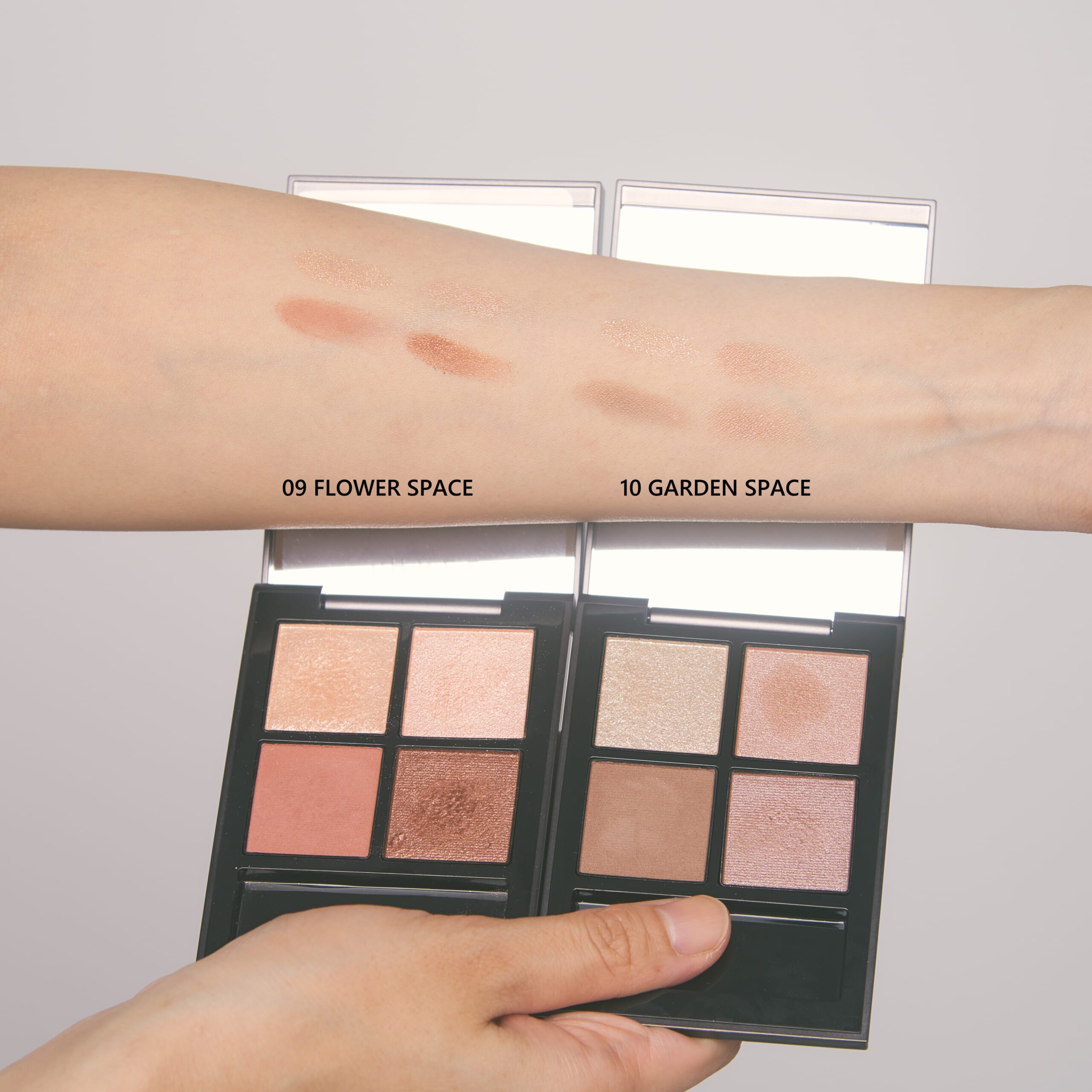ニュートラルな色と「サテン」「メタリック」「マット」「カラーヴェール」という4種の質感で目もとを彩るアイカラーパレット。左が【09 FLOWER SPACE】、右が【10 GARDEN SPACE】。
