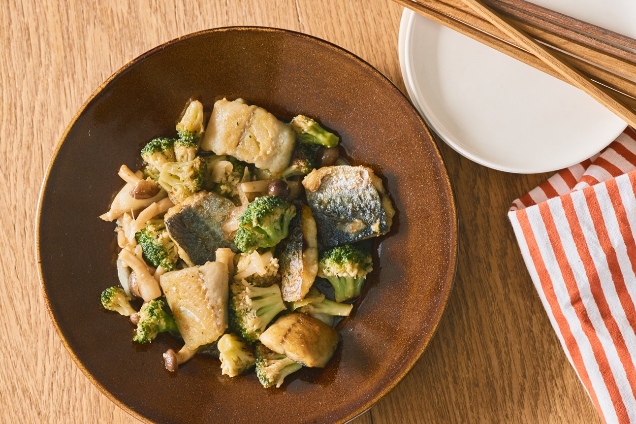 下処理が面倒でつい敬遠しがちな魚類も、カットされているから調理のストレスゼロ。こんな炒め物ならお肉感覚で食べられて、夫や子どももよろこびそう。ガーリック風味で食欲をそそる一品です。さわらにはカルシウムの吸収を促すビタミンDが、ブロッコリーには抗酸化作用の強いビタミンCや葉酸が豊富。