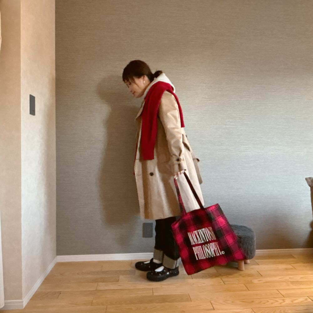 「コートを着ても赤が映える! 靴下と手袋を赤で合わせて。存在感のある赤チェックトートが、シンプルなコーデのアクセントになりました!