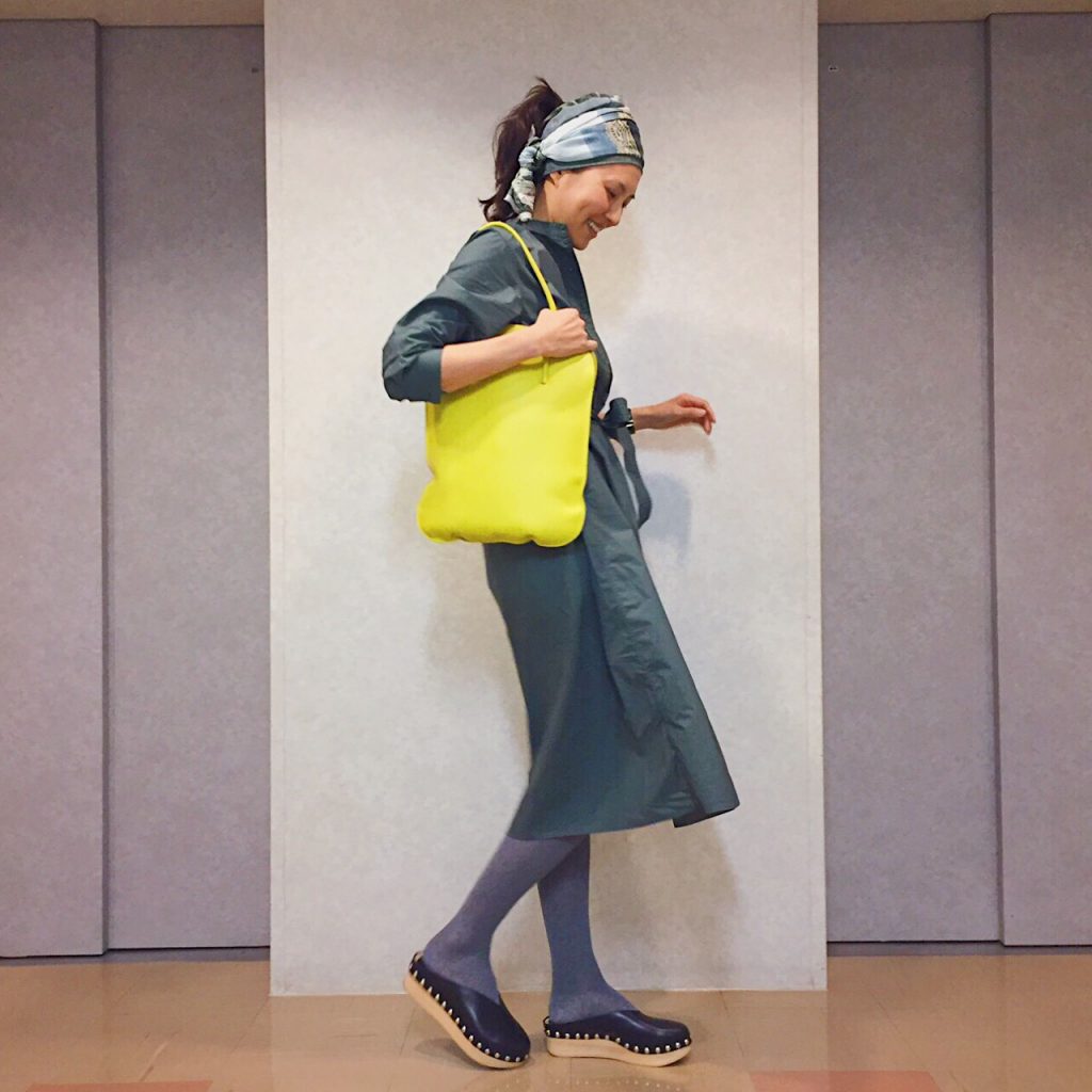 この日は全体的にグレイッシュなコーディネートだったので、鮮やかな黄色のバッグをさし色にしました。