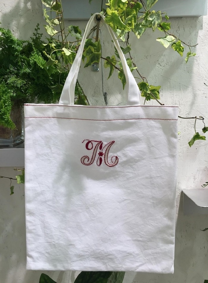 作品完成後、希望者はトートバッグへのお仕立てを依頼するサービスも。ミュベールのオリジナルネームプレイトも付けてもらえるから、ますます嬉しい!(受講料以外に1,500円+taxを別途支払い)
