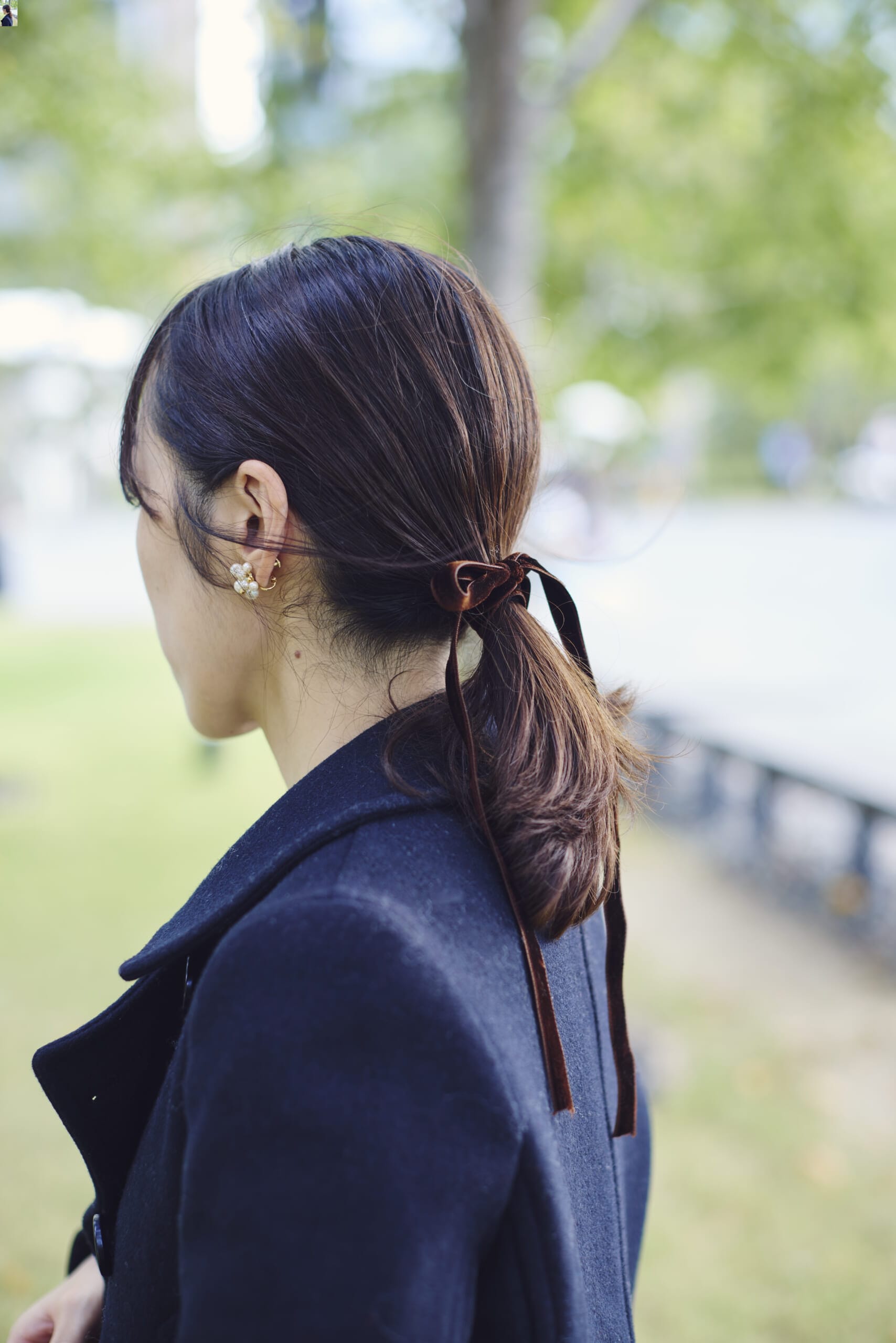 「娘の入学式で首元に結ぶ用として、手芸店で購入したリボン。ヘアゴムとして使用してみたら、長さも、髪色に馴染む色味も完璧! ベロア素材なので、後ろ姿にクラシカルな雰囲気を出せるところも気に入っています」