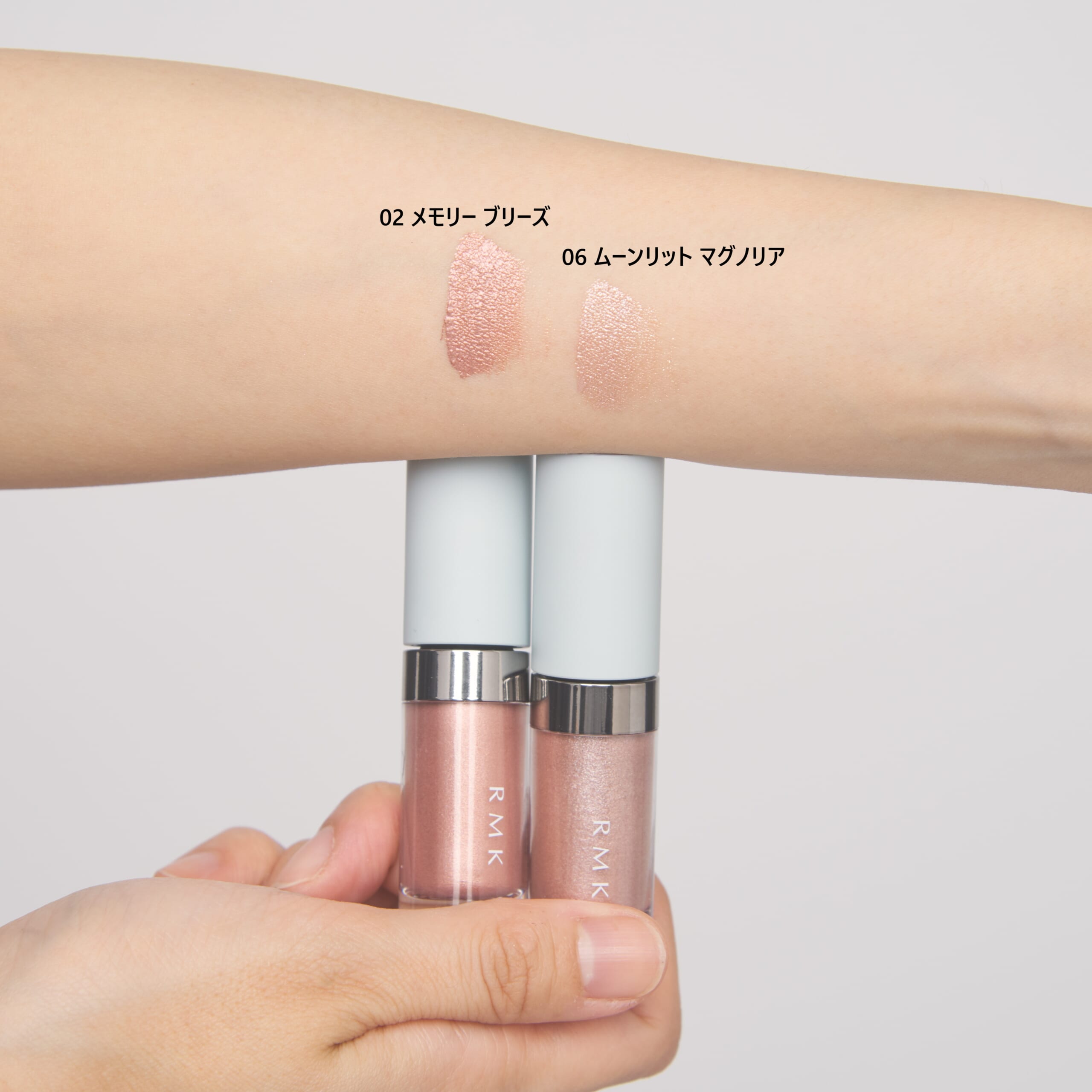 左から、【02 メモリー ブリーズ】【06 ムーンリット マグノリア】。色ごとに大小さまざまなパールをベストバランスで配合し、テクニックレスで濡れたようなきらめきや際立つメリハリをもたらしてくれます。