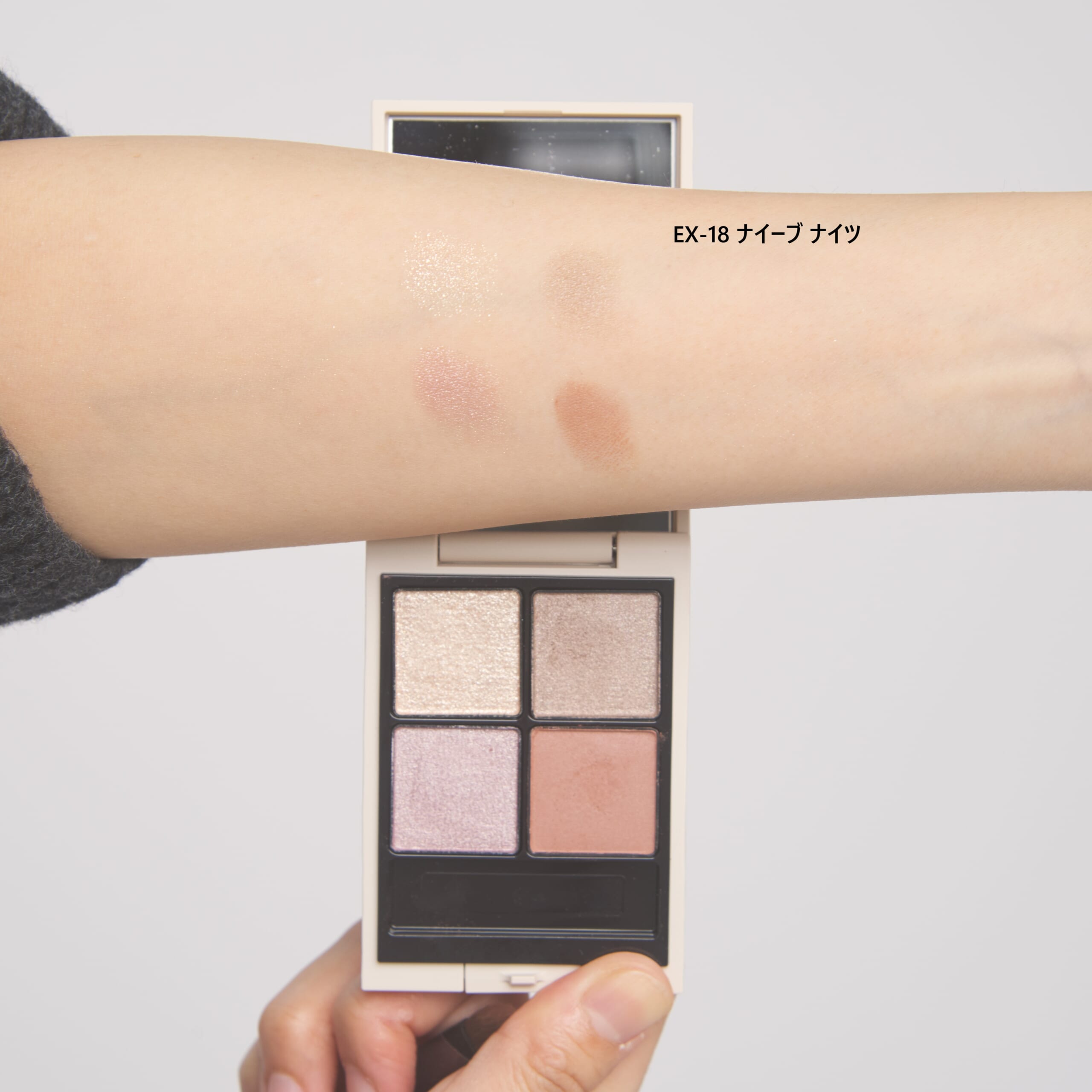 【EX-18 ナイーブ ナイツ】は陽射しが刻々と表情を変えてゆく、切なくも甘美な春の夕暮れをイメージしたパレット。彩度も深みも抑えた、淡くモダンなカラーに惚れ惚れ。一見、テクニックが必要そうな4色ですが、重ねるほどに美しく絡み合いまとまりのある優しい目もとを演出してくれます。