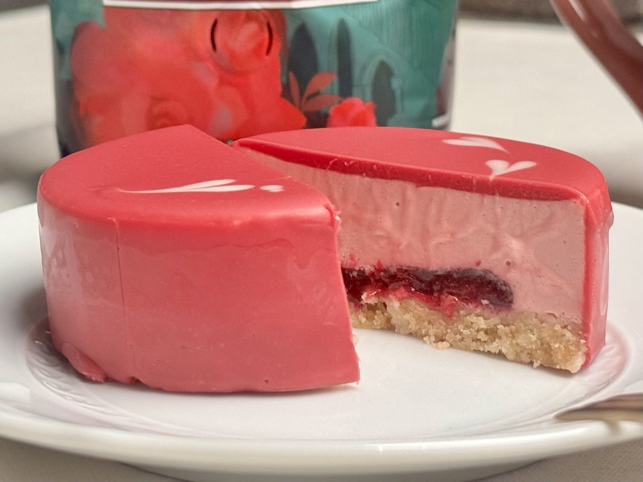 クリームカカオベースにヘーゼルナッツフレーバーシロップを重ね、ふんわりと軽やかなショコラムースと、艶をまとったレッドベリーグラサージュソース、そしてサクッとした食感のストロベリーフレーバーキャンディーがトッピングされています。