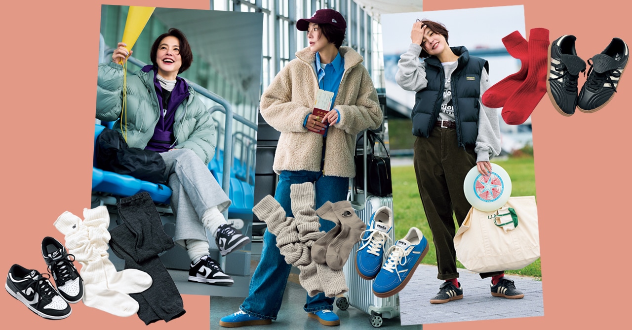 アディダス、ナイキ…【屋外で過ごす日のパンツ×スニーカーコーデ3選】ハイテク靴下やレギンスで防寒はぬかりなく!
