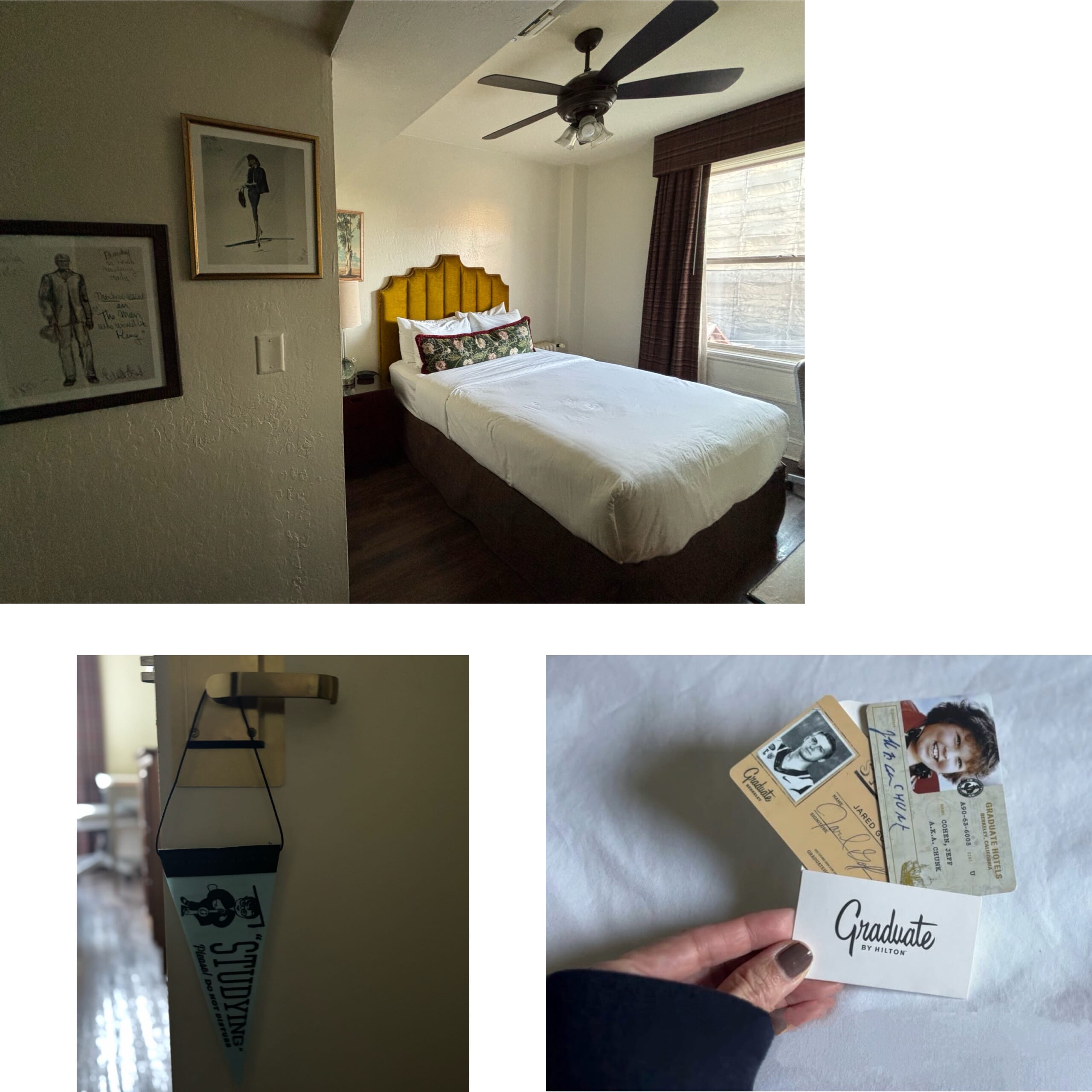 バークレーで滞在した「Graduate by Hilton Berkeley」は、カードキーやデスク、チェア、(左下)ドアノブにかけるフラッグに至るまで、大学街らしいノスタルジックな雰囲気に包まれたホテル。