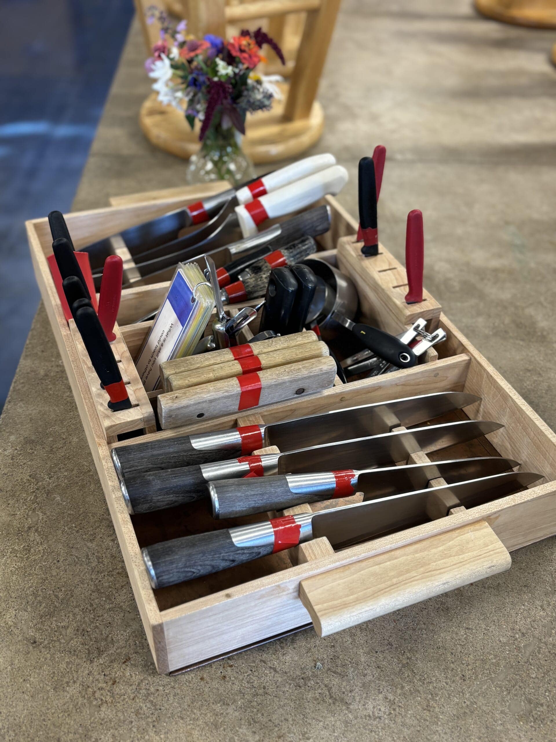 調理道具はテーブルごとに色分けされ、使われている器具もプロ仕様。本物に触れる体験が自然に組み込まれているのがすばらしく、世界中から視察に訪れる人がいるというのも納得!