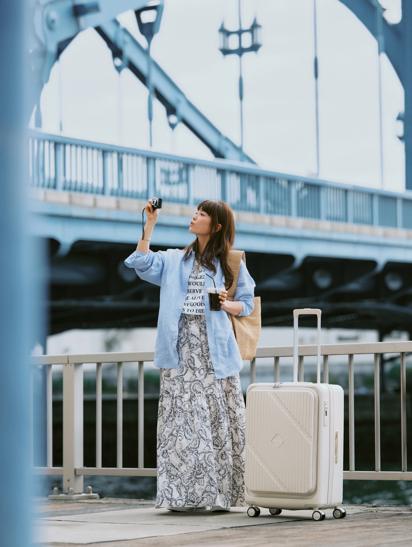 「ヴェロックス」最大の特長は、ワンプッシュ操作で簡単にホイールにブレーキがかかるシステム。緩やかに傾斜したスロープや揺れる電車やバスの中でも、ピタッと止まってくれるのでスーツケースがひとり歩きする心配は無用です。例えばこんなふうに急にシャッターチャンスが訪れて、両手が塞がるような場面でも、安定感バッチリ!