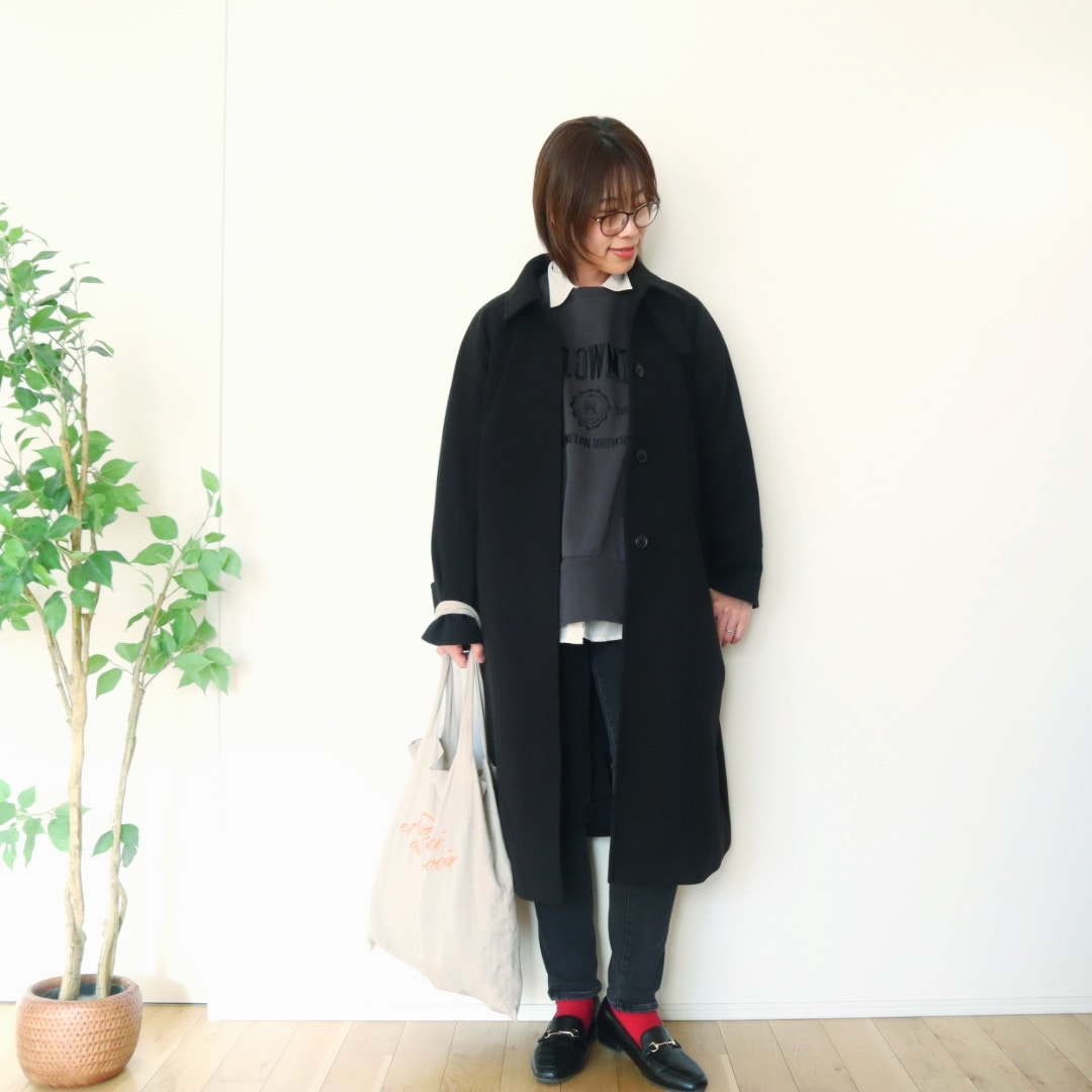 「ボアのPコートに先日購入したGUのリブニットソックスブーツを合わせて。冬服はそのままでも、ボトムを変えるだけで一気に新鮮に。この日は気分ウキウキで、そのままお買い物へ。春になったらGジャン合わせで軽やかに着たいな……と妄想中です♡
