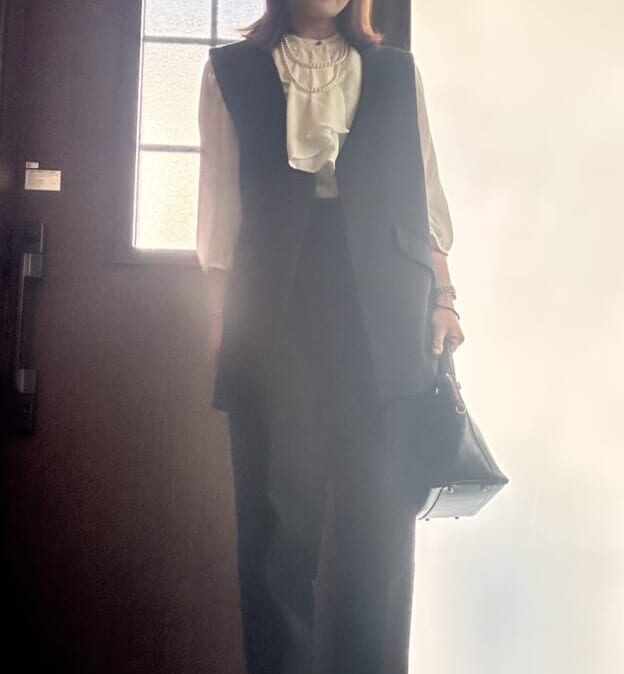 【40代ママのハレの日コーデ】リボンブラウスとジレのセットアップで “動ける”スタイル!卒業式・入学式