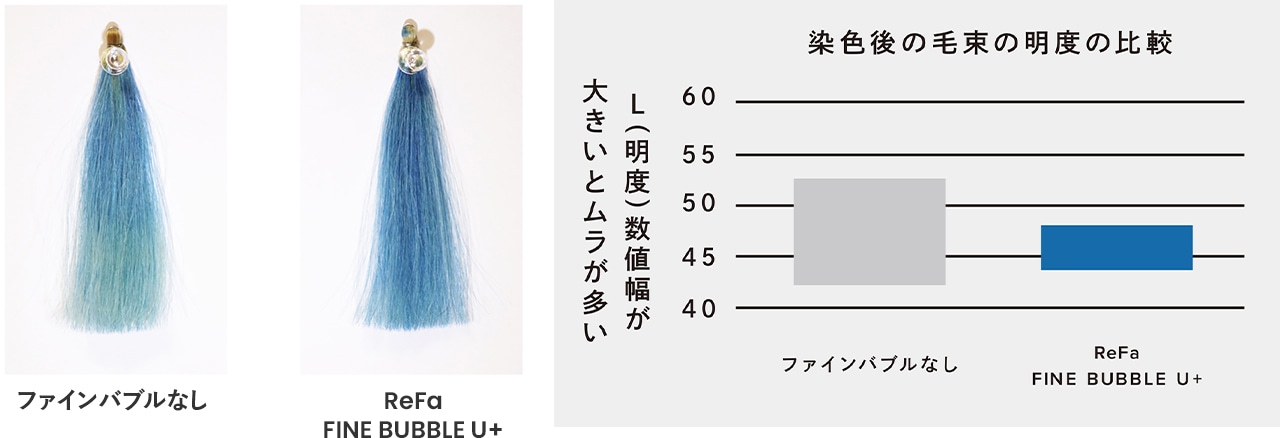 さらに金属イオンまで吸着し取り除くことで、トリートメントが浸透しやすい環境をつくります。下の画像は分かりやすいように青いカラートリートメントを用いた実験結果。ファインバブルの効果でムラなくブルーに染まっているのが分かります。
