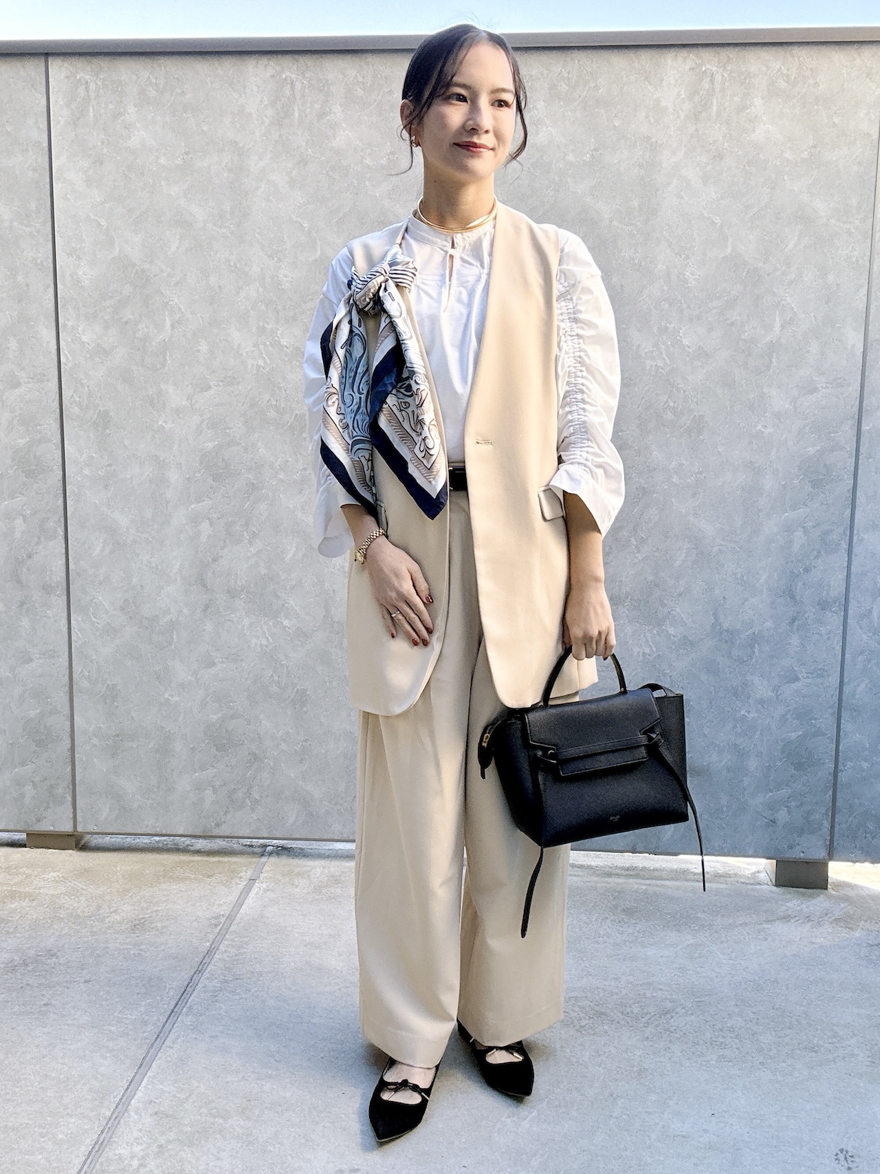 「ジレとパンツは、アダム エ ロペで購入したセットアップ。つい落ち着いた色を手に取りがちですが、3人目の末っ子ということで、『これで入園式は最後かも……』と思い、顔映えする明るいベージュにチャレンジしてみました。4月の暖かい日だったので、ジャケットではなくジレにして正解。胸元にワンポイントで巻いたスカーフは、もしもの際に肩からさっとはおる寒さ対策の役割も」